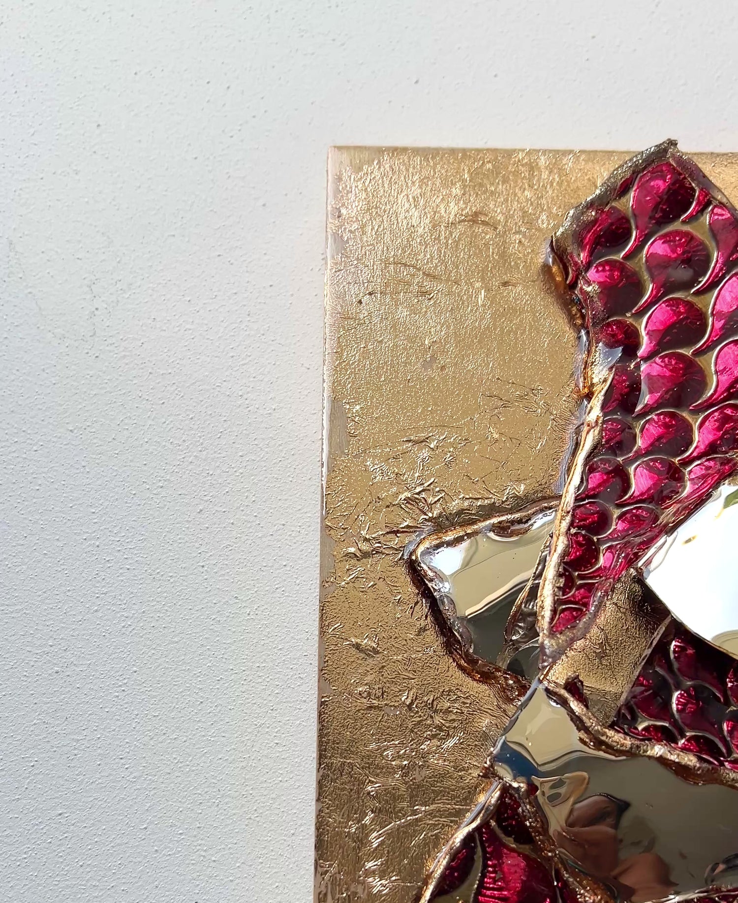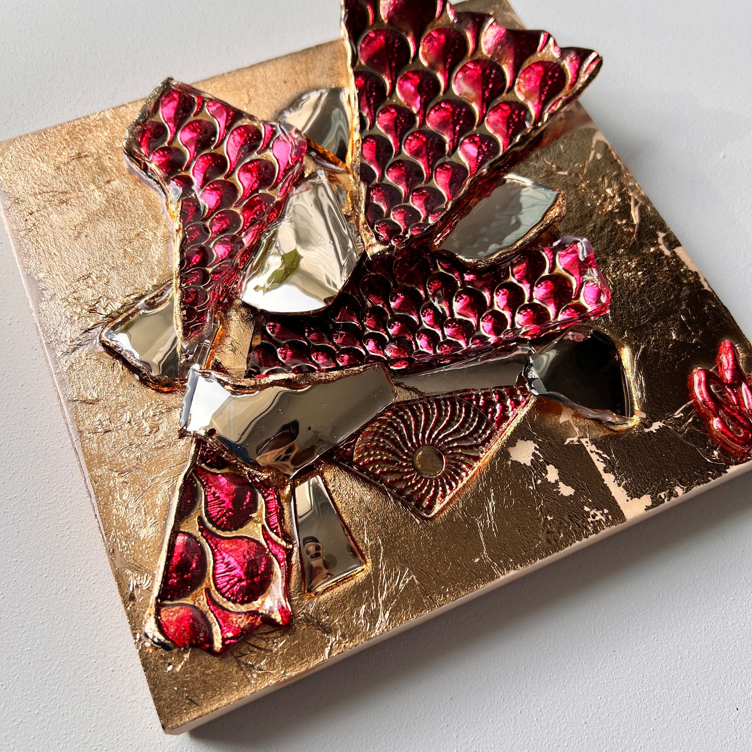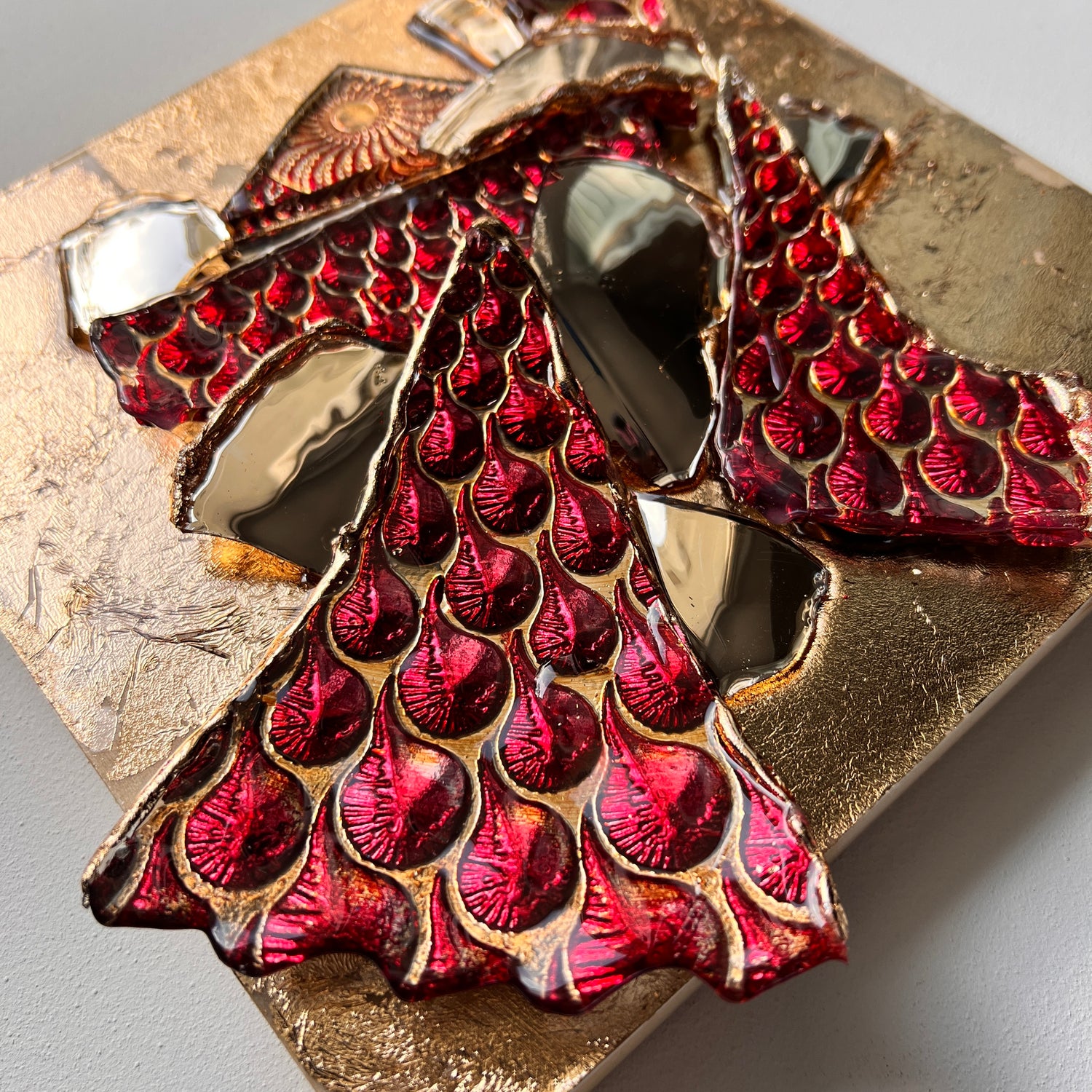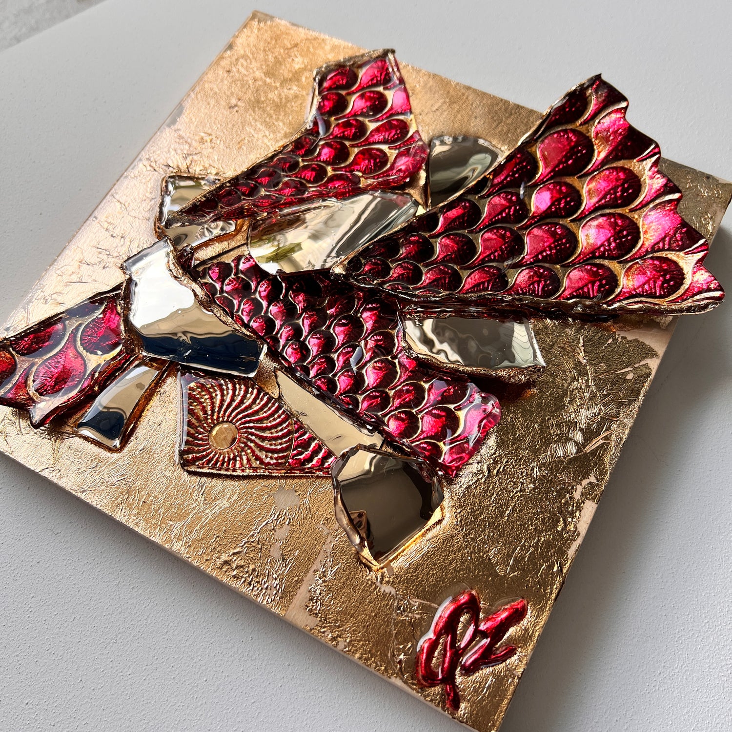 A baby red dragon curled at the heart of the artwork, its tiny scales shimmering like ruby embers dusted in glitter and gold. It looked as if it had hatched straight from the canvas itself, nestled among strokes of molten color and flecks of radiant glass. Though small, its presence felt powerful, an ancient spark newly awakened, breathing warmth into every corner of the piece. With each glint of light, the dragon seemed to shift and flutter, as if preparing to spread its gleaming wings and rise, carrying the artwork’s magic into the world beyond the frame.