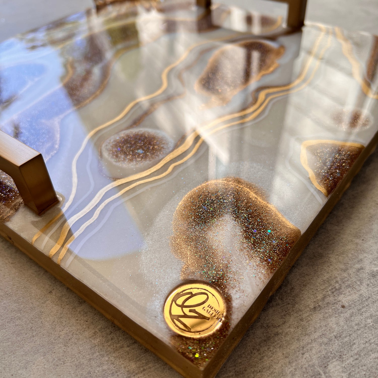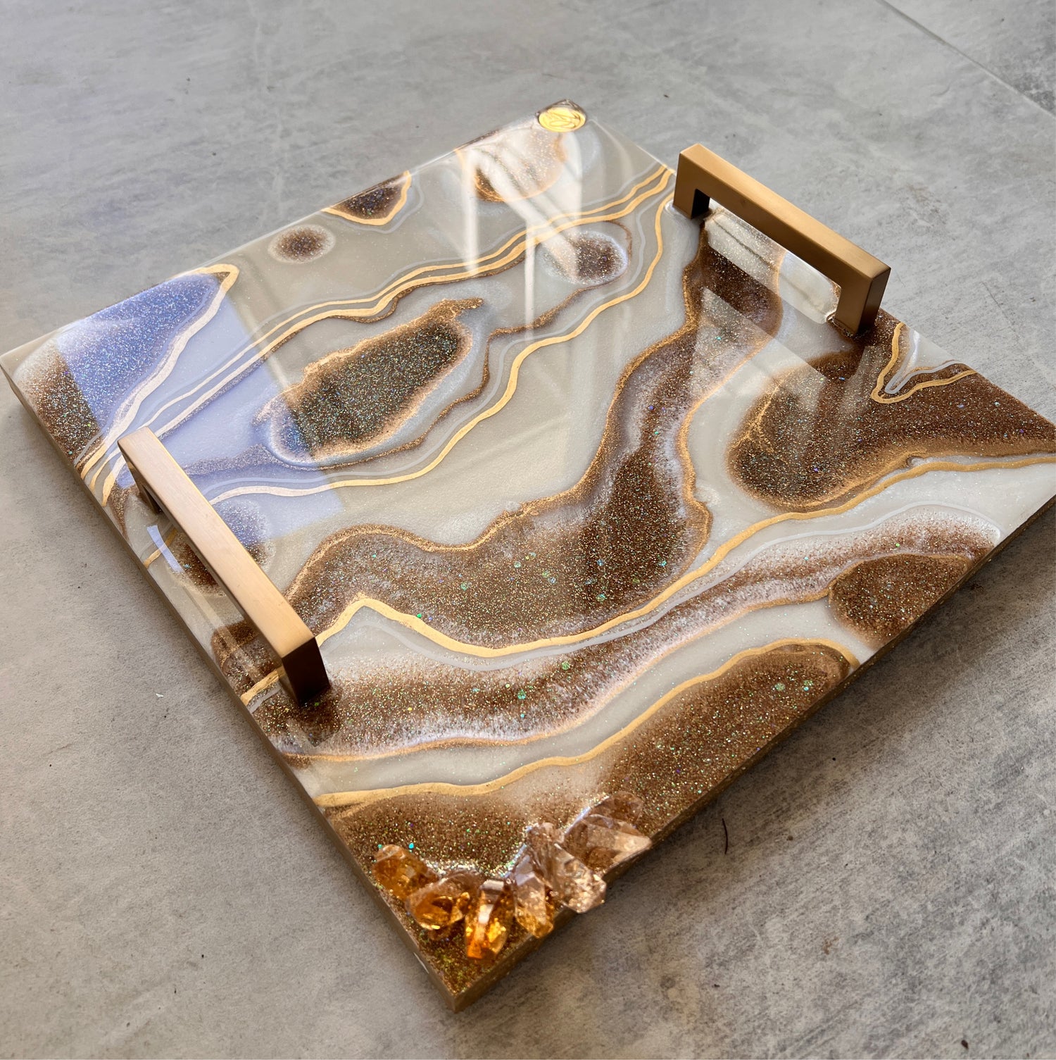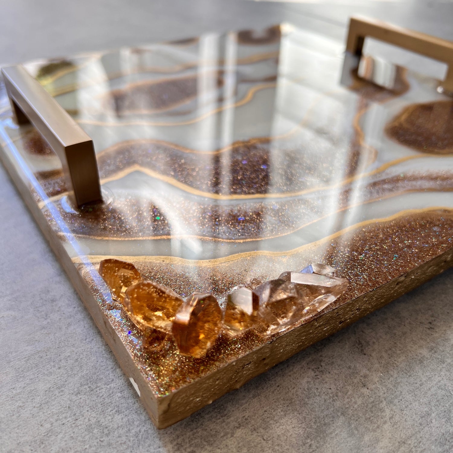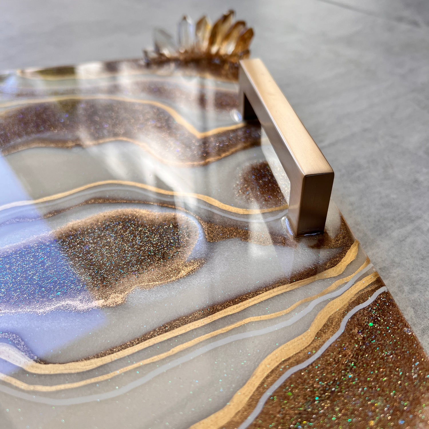 This bronze and champagne gold luxury tray is handcrafted from raw wood and built in layers using wood primer, epoxy resin, pigments, crushed glass and resin crystals.