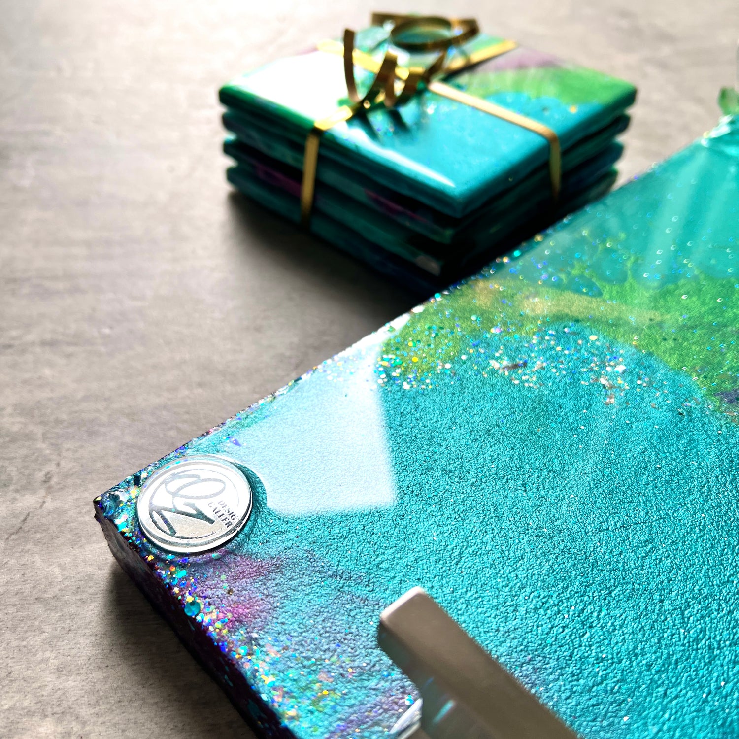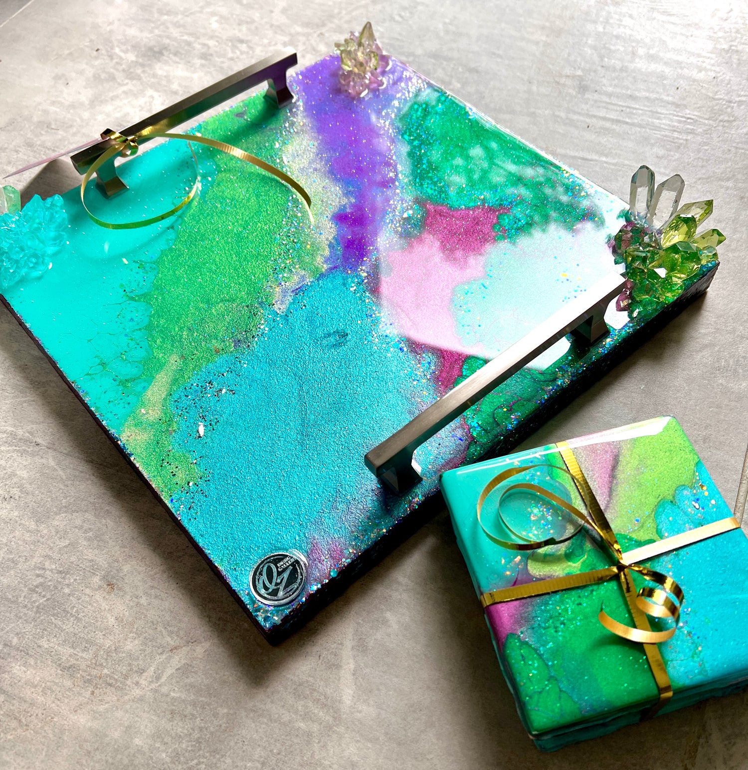 This luxury tray handcrafted from wood is unique, is built and layers using wood primer, acrylic paint, epoxy resin, pigments, crushed glass and resin crystals. This glam tray comes with a matching 4pc coaster set.