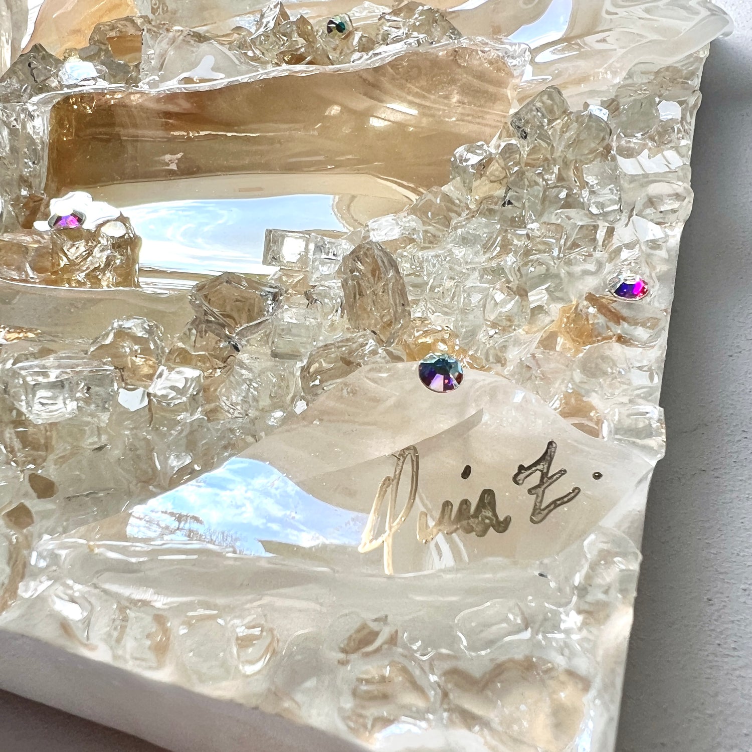 Legend tells that this piece captures a single, enchanted moment when a secret garden bloomed entirely in light. No soil, no shadows, just pure radiance taking the form of leaves. Each cluster of crystal and crushed glass marks where a wish once landed, rooting itself in brilliance instead of earth.