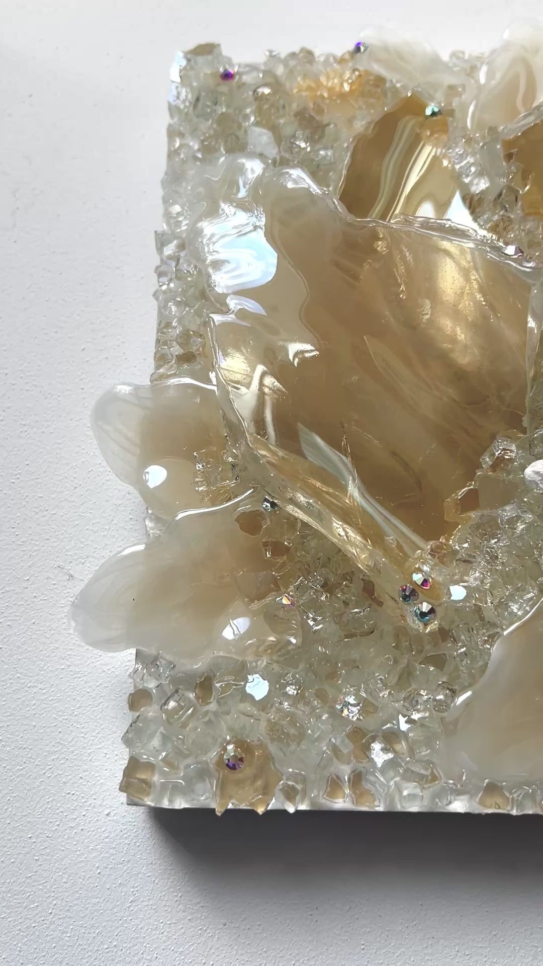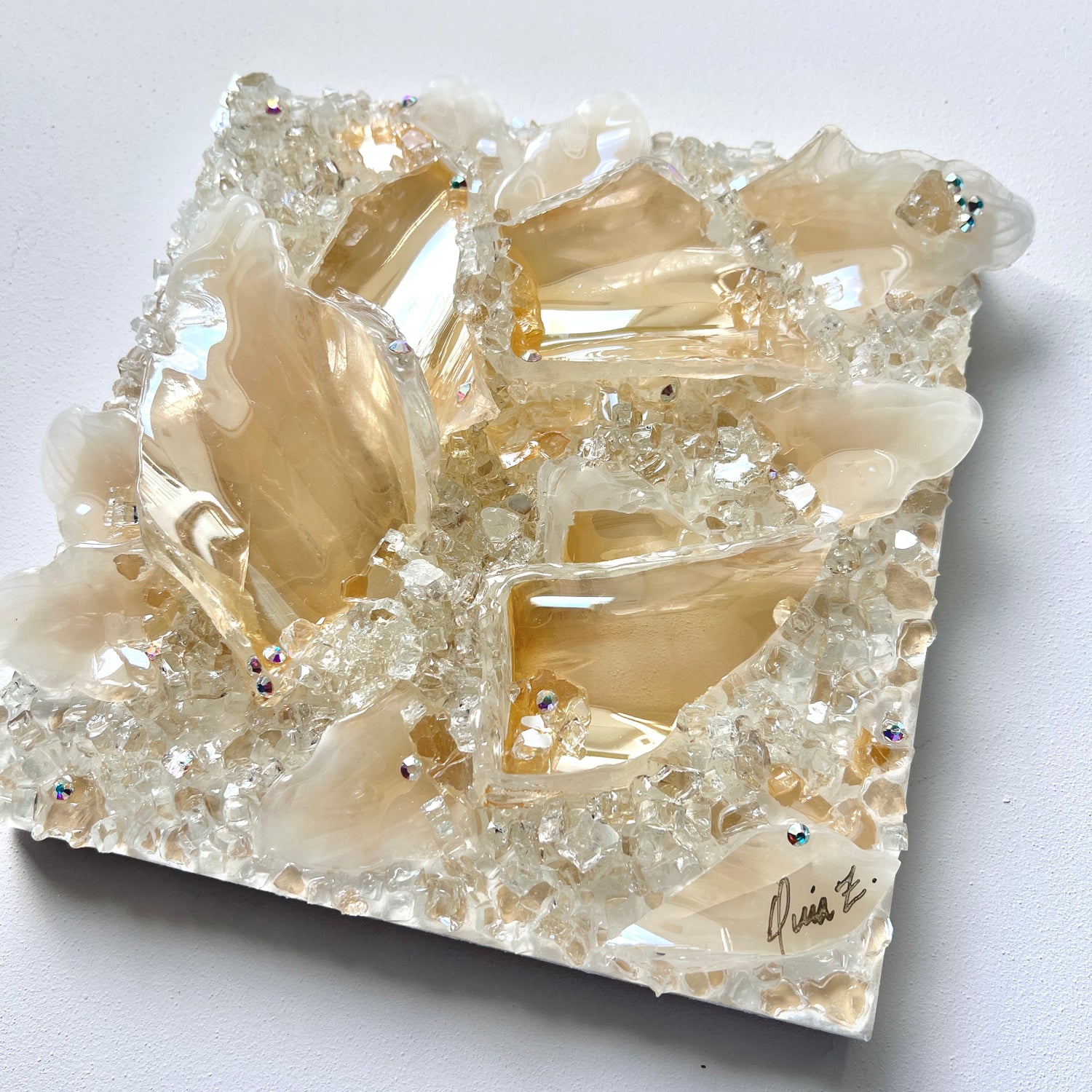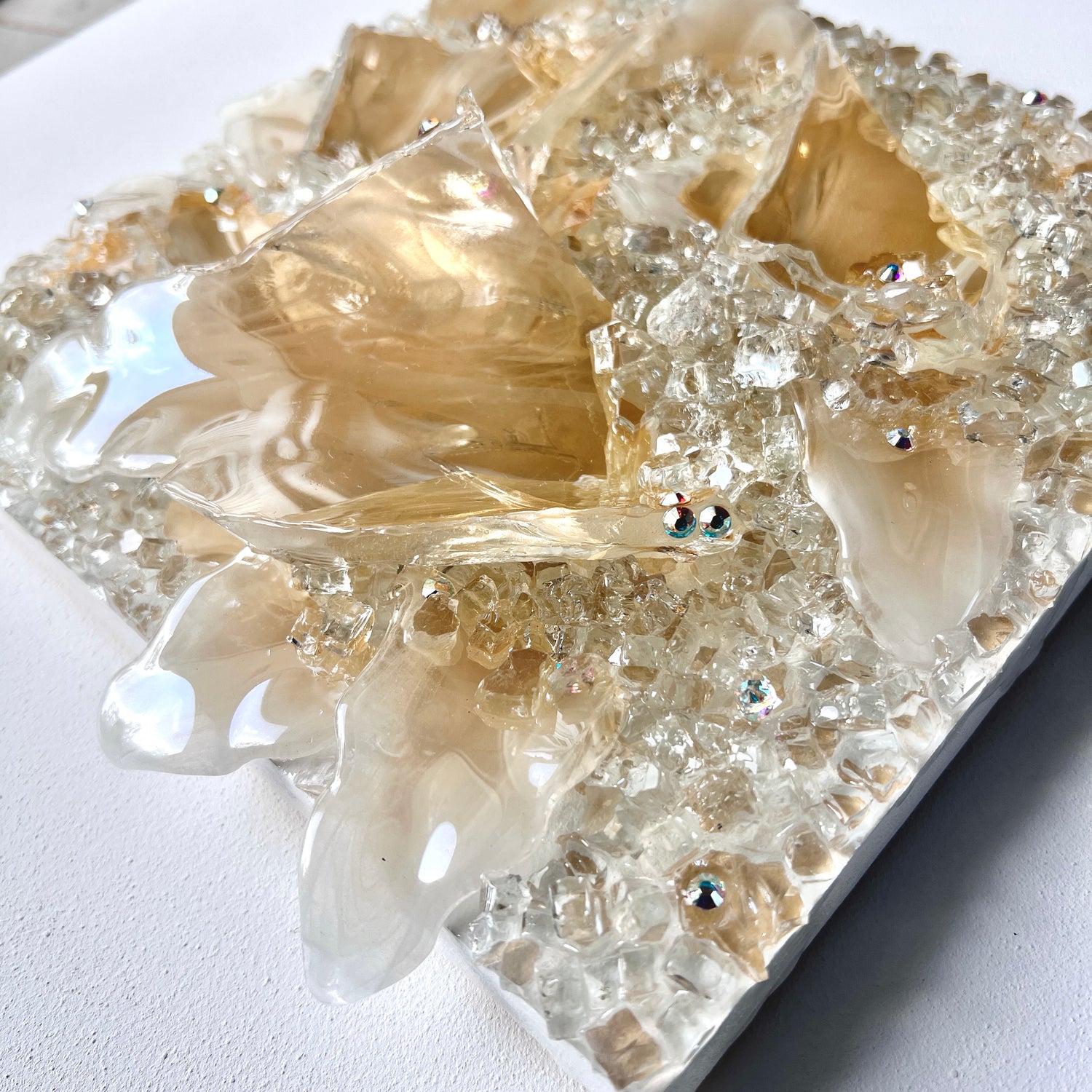 The artwork shimmers like a garden waking at first light. Every inch is covered in pearlescent glass shaped into delicate leaves, their surfaces catching soft glows like morning dew. Between them, sprinkles of crushed glass and scattered Austrian crystals glint like hidden treasures, tiny stars resting in the branches.