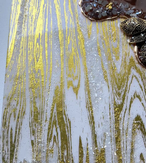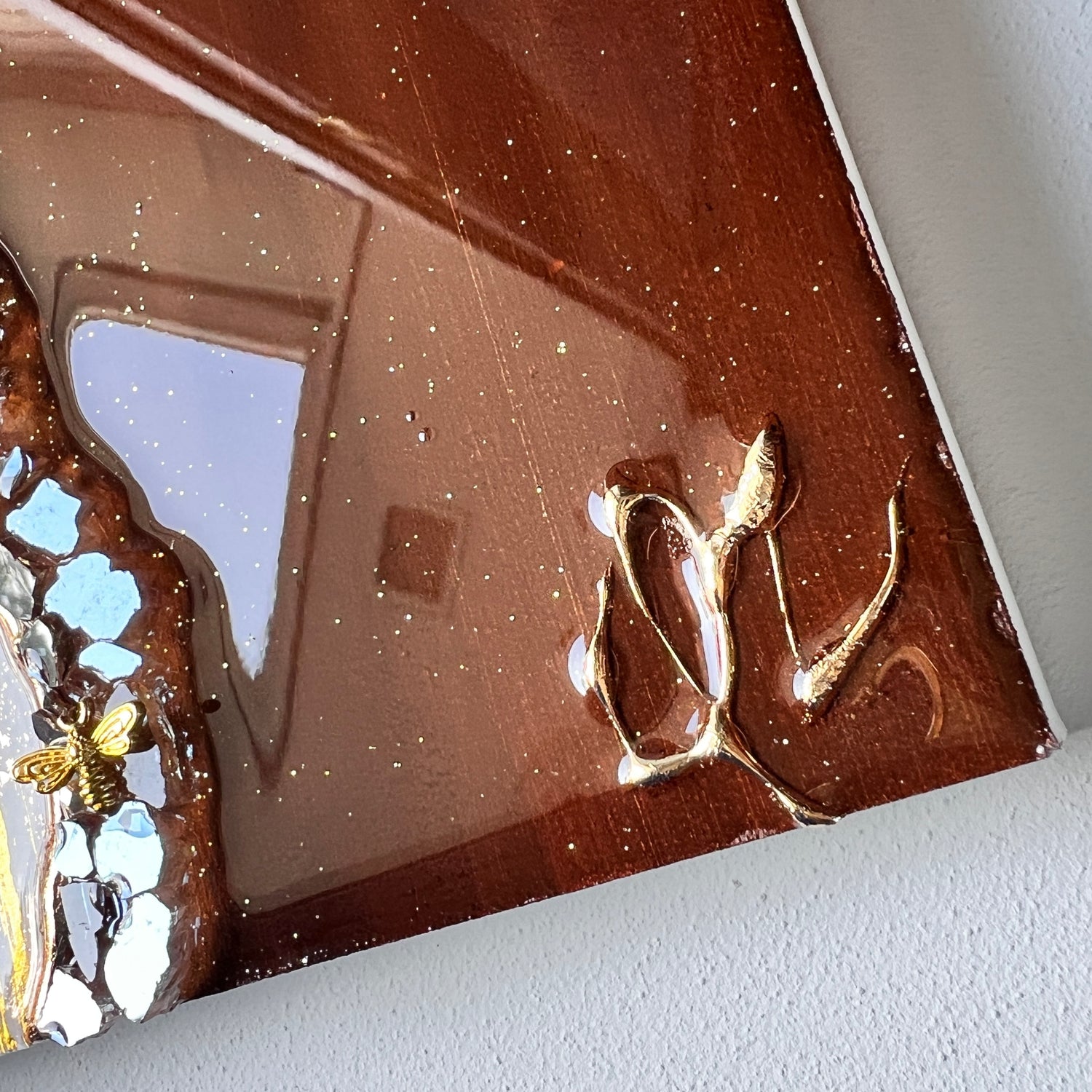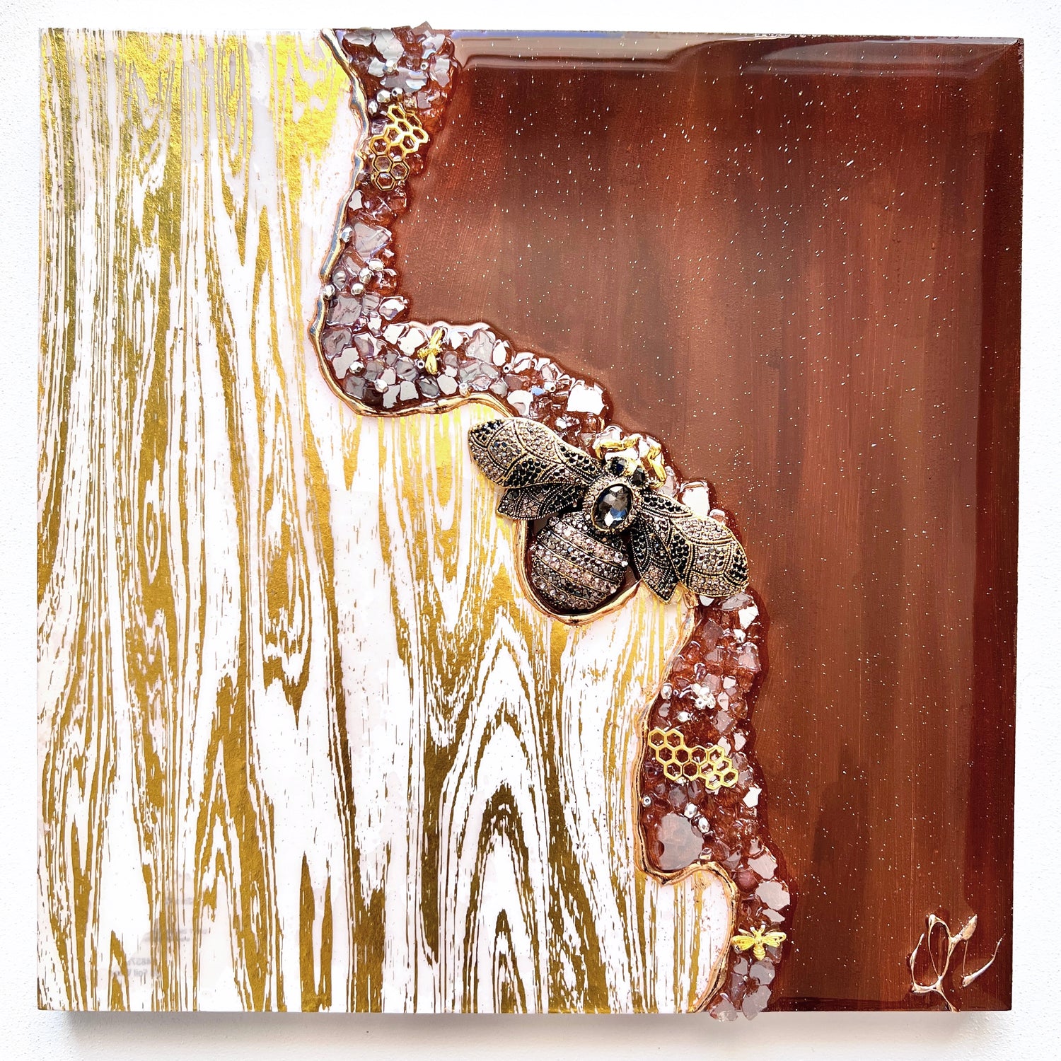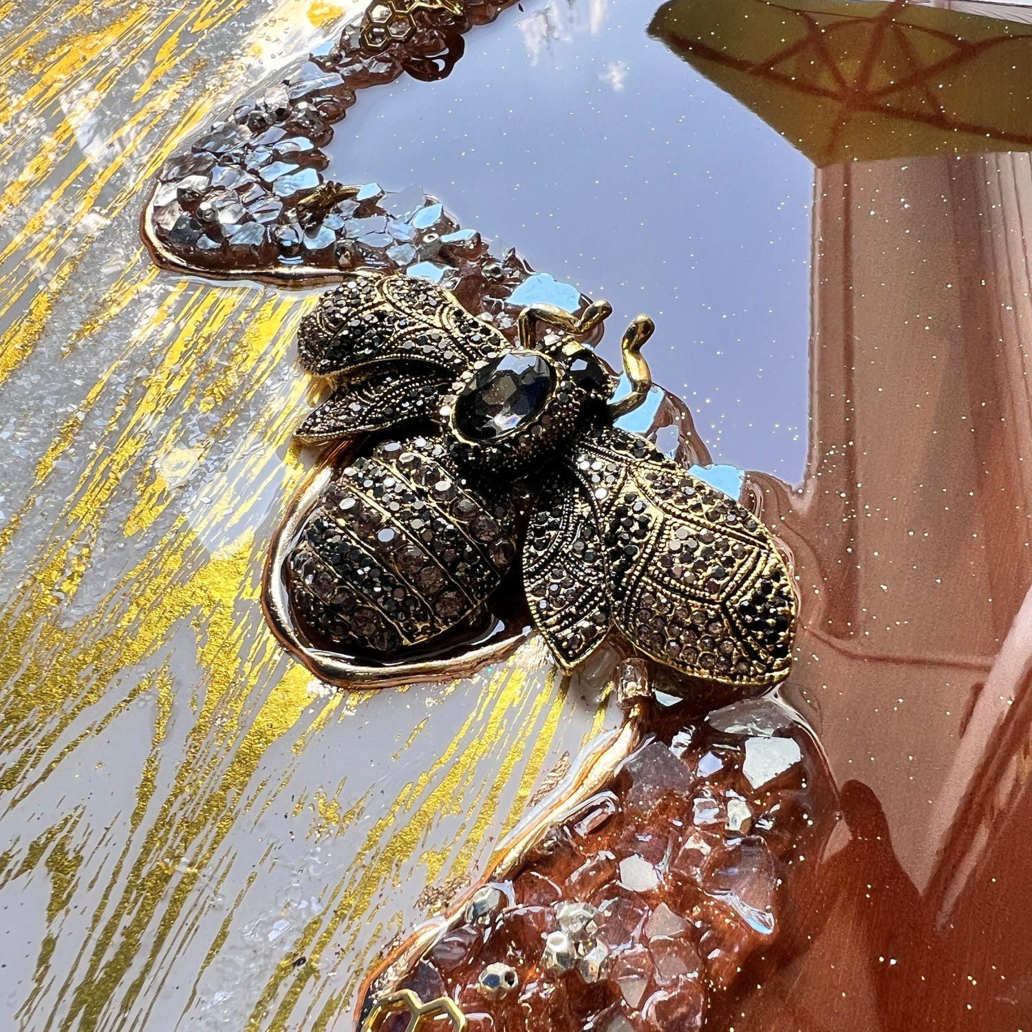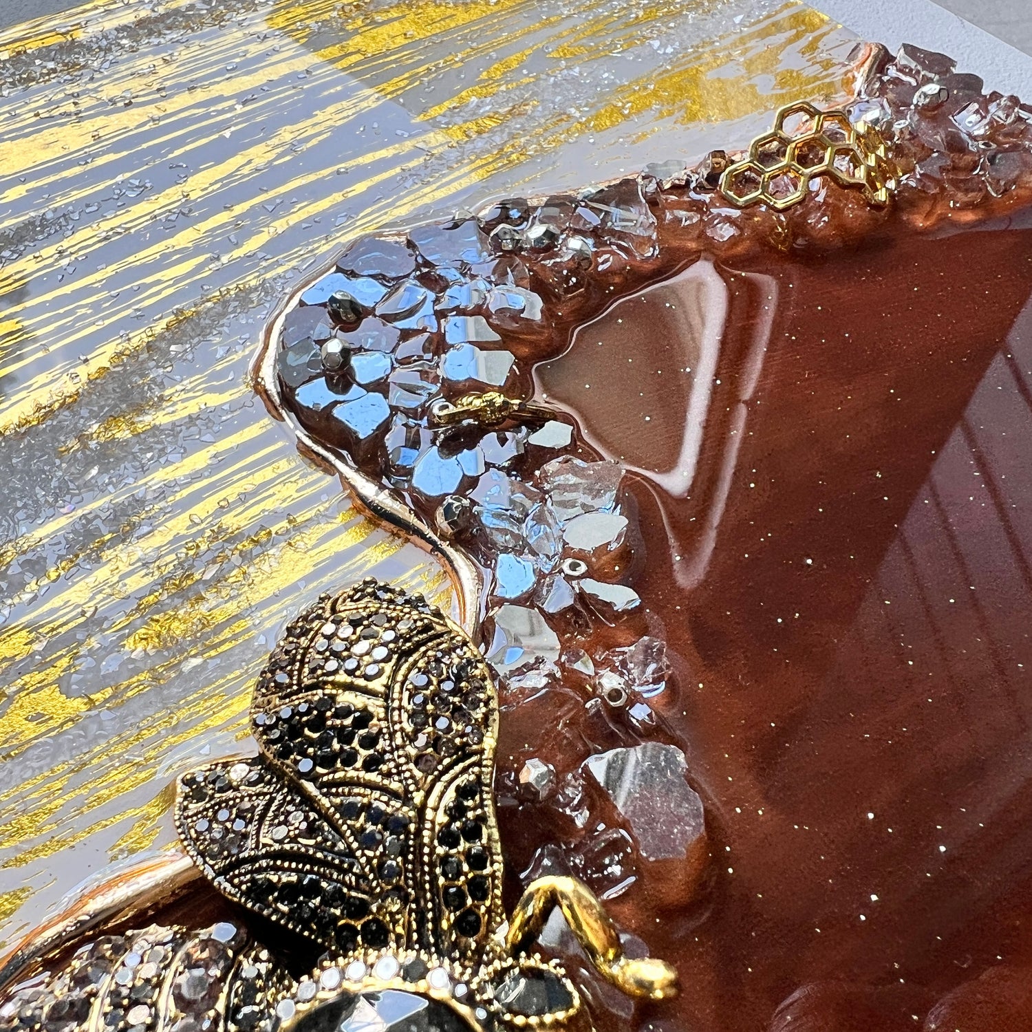 In a quiet corner of an ancient forest, sunlight poured over a fallen tree whose wood still shimmered with honey-gold grain. From its warm surface rose the Queen, crafted in rhinestone brilliance. Her wings catching bits of mirrored light like morning dew. Around her, fragments of reflective glass glimmered like the loyal hum of a thousand workers in flight. This artwork captures the hush of her kingdom: a realm where resilience is carved in wood, beauty is born in contrast, and the Queen rules with a radiant calm that turns even broken pieces into treasure.