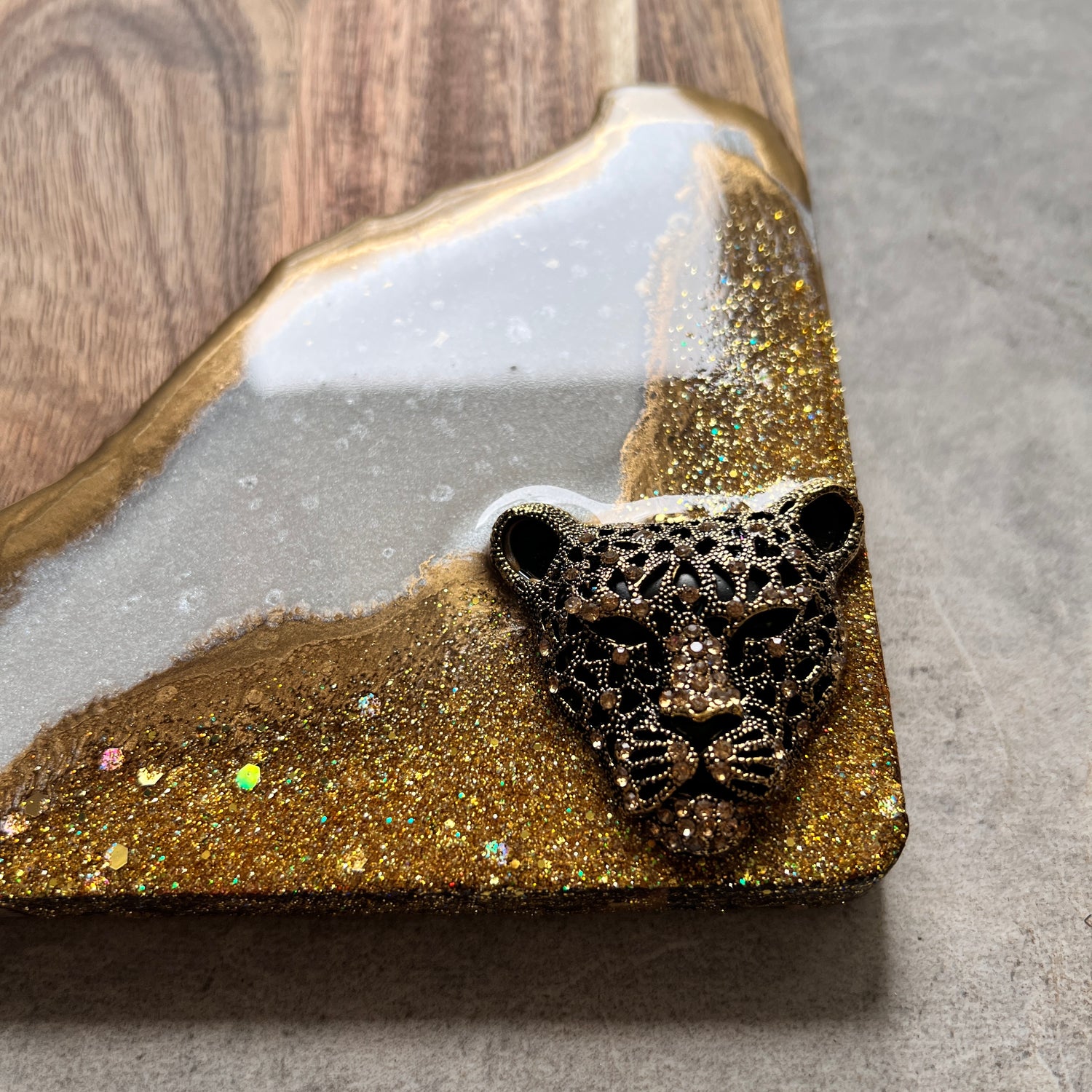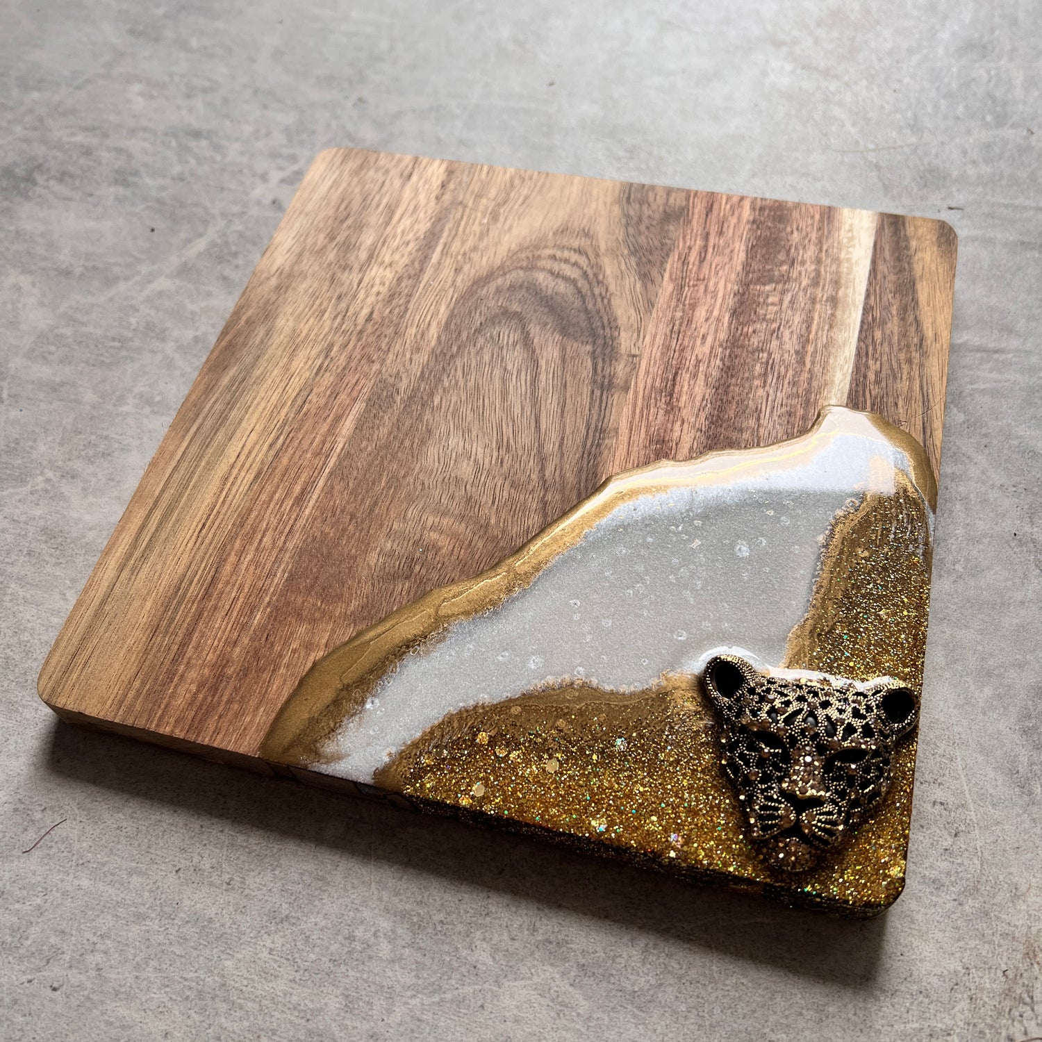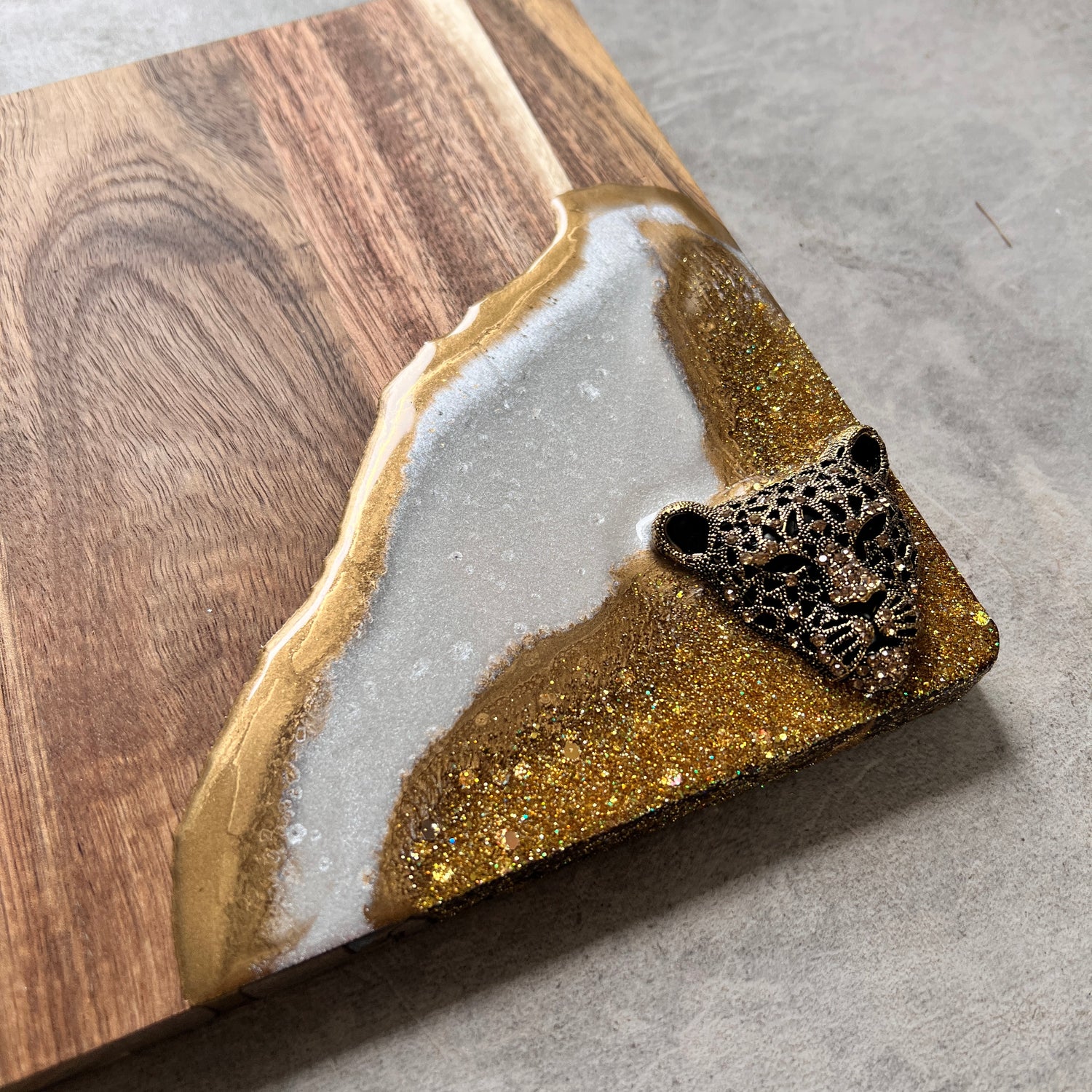 All artwork is sealed with a FDA compliant epoxy resin for incidental food contact. These decadent charcuterie boards should never be cut on. Wax paper can be used to display food and will prolong the life of your board.