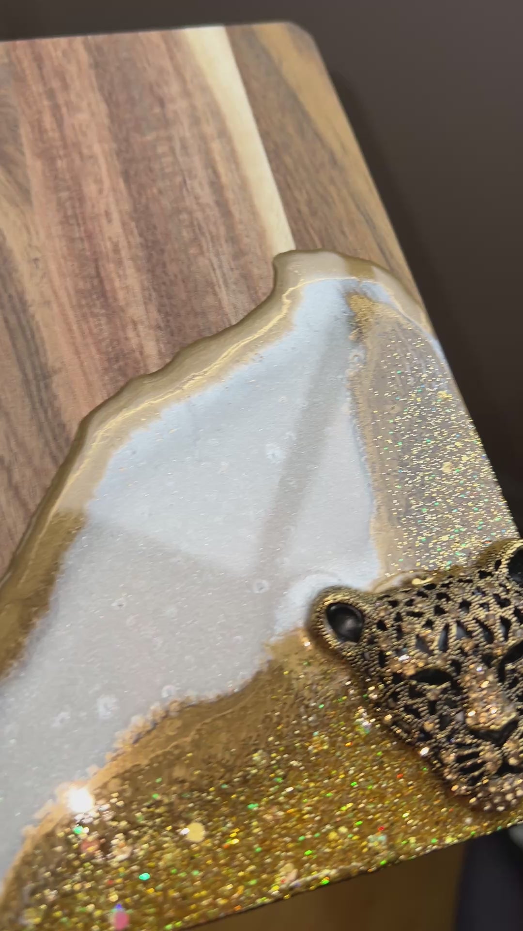 This charcuterie board is completely unique with its blend of colors. Made with Epoxy Resin Art, crushed glass and mixed media embellishments.