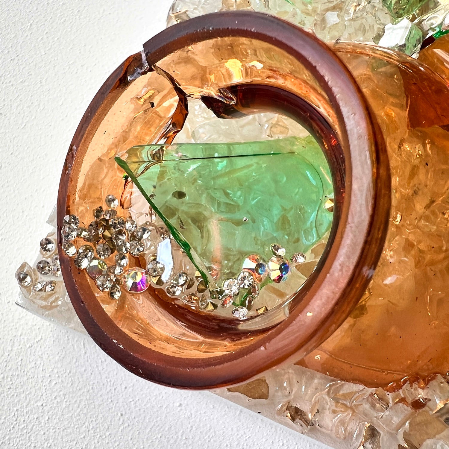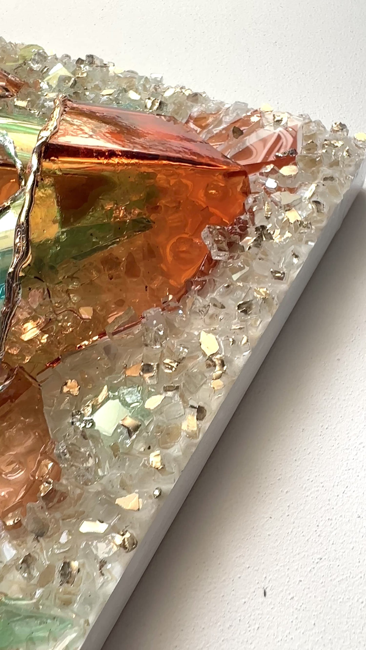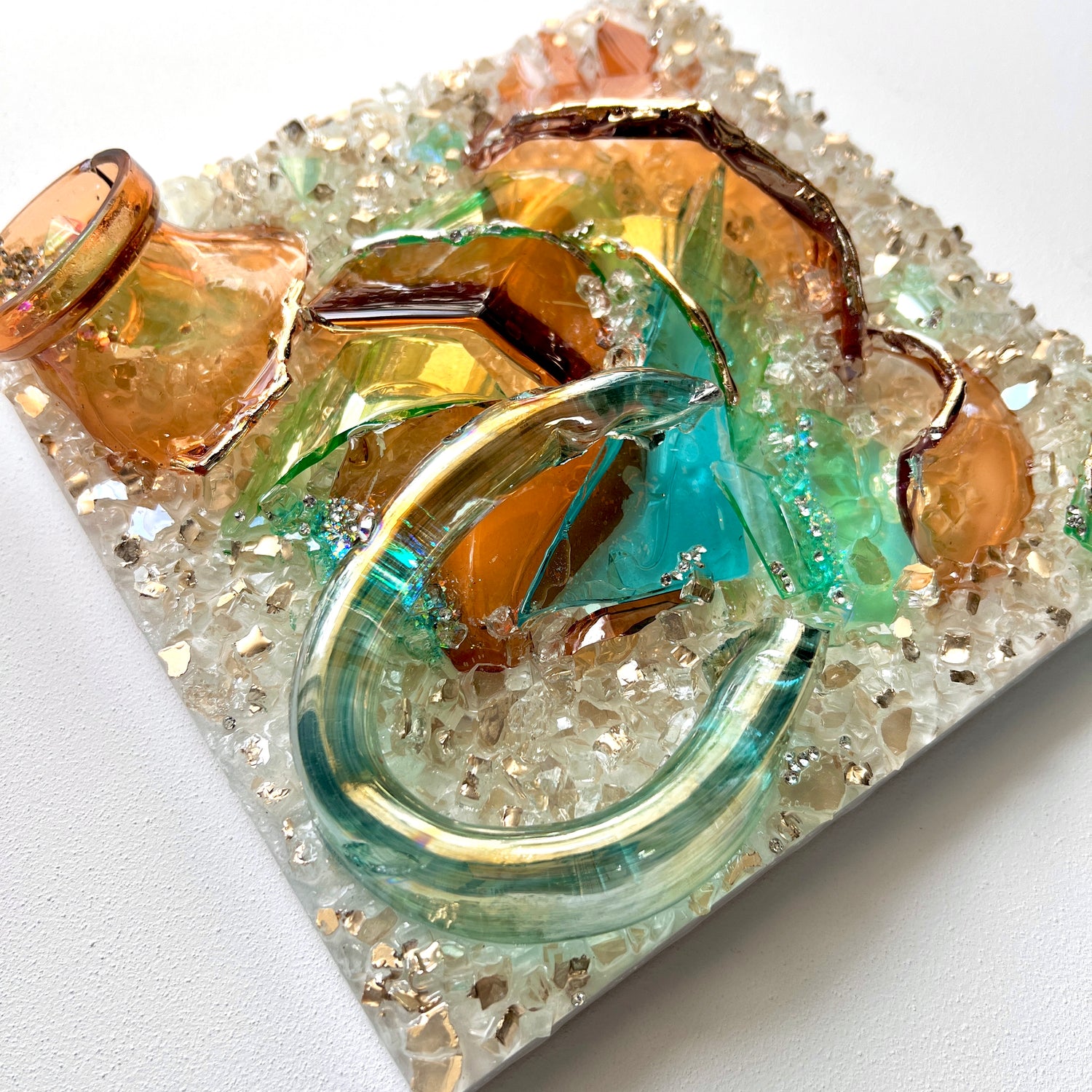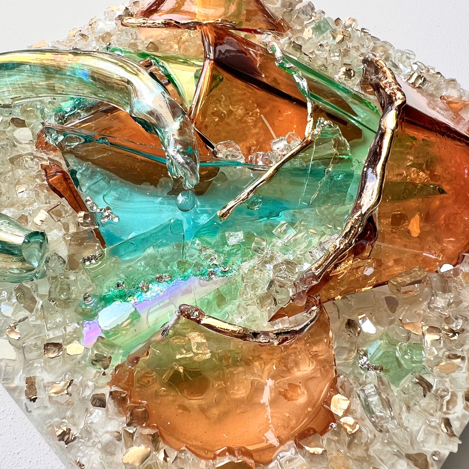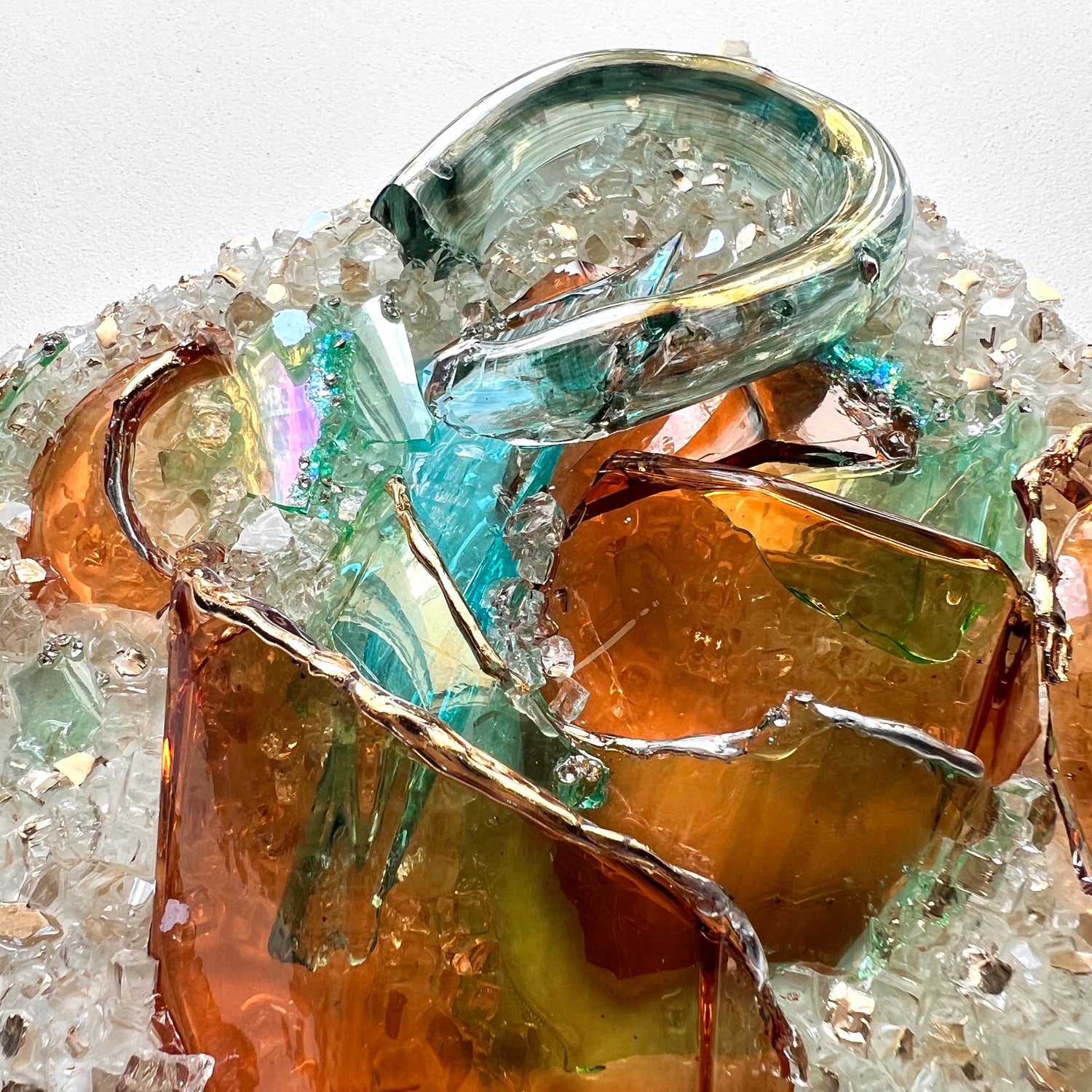 In this piece, the burnt orange and blue glass meet like two worlds colliding—warmth and calm, fire and tide. At the edge lies a shattered bottle, frozen in the moment it gave way, capturing the exact second when holding on becomes too heavy and release becomes the only path forward. The stream of tiny crystals spill like memories finally set free. They scatter and settle into a shimmering bed of crushed glass, each fragment catching the light and retelling its own quiet story. “Moment of Release” is a beauty that can only be born when something breaks open, allowing what’s hidden to pour into the world.