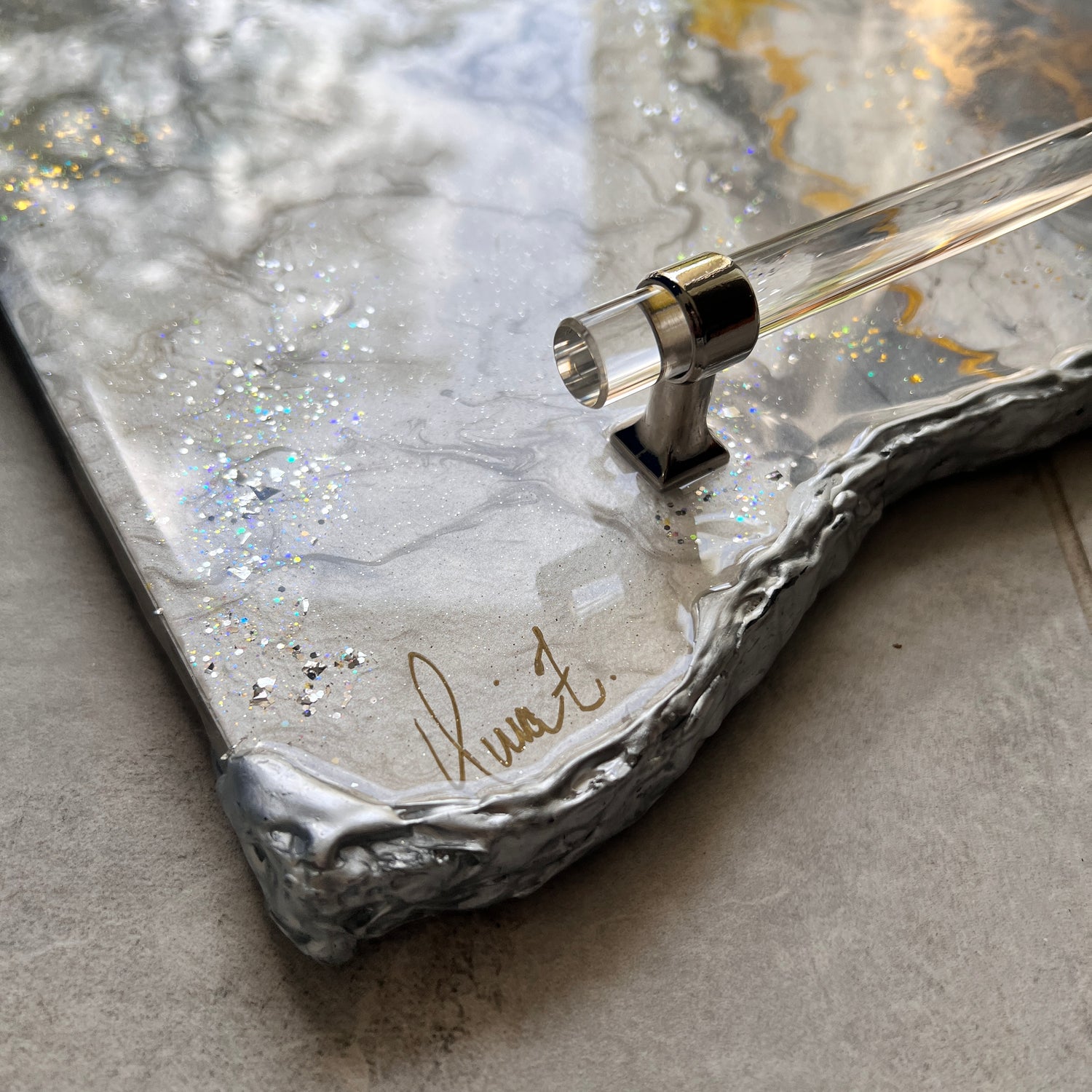 This neutral luxury handcrafted from raw wood is truly unique and built in layers using epoxy resin, pigments, crushed glass, resin crystals and silver edges!