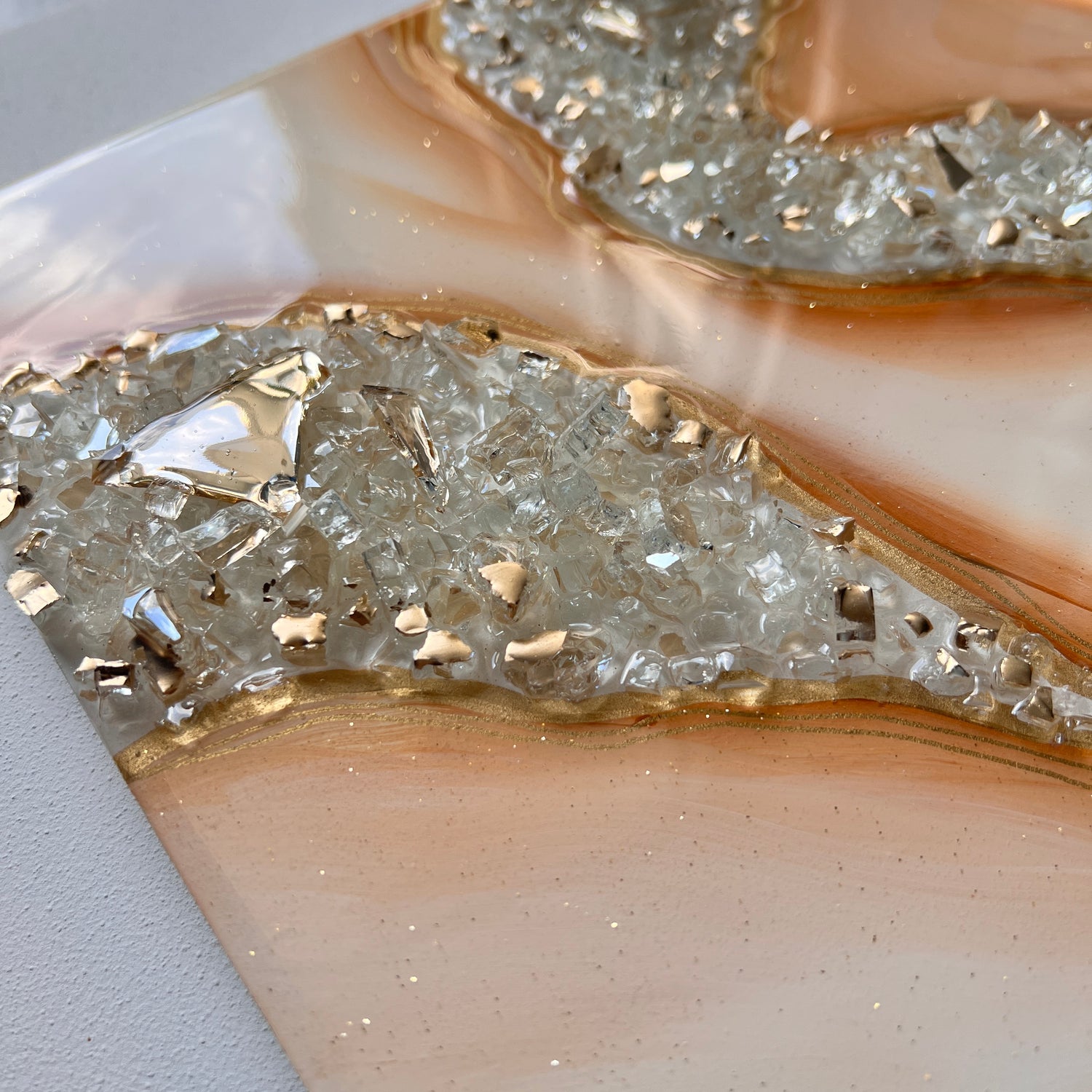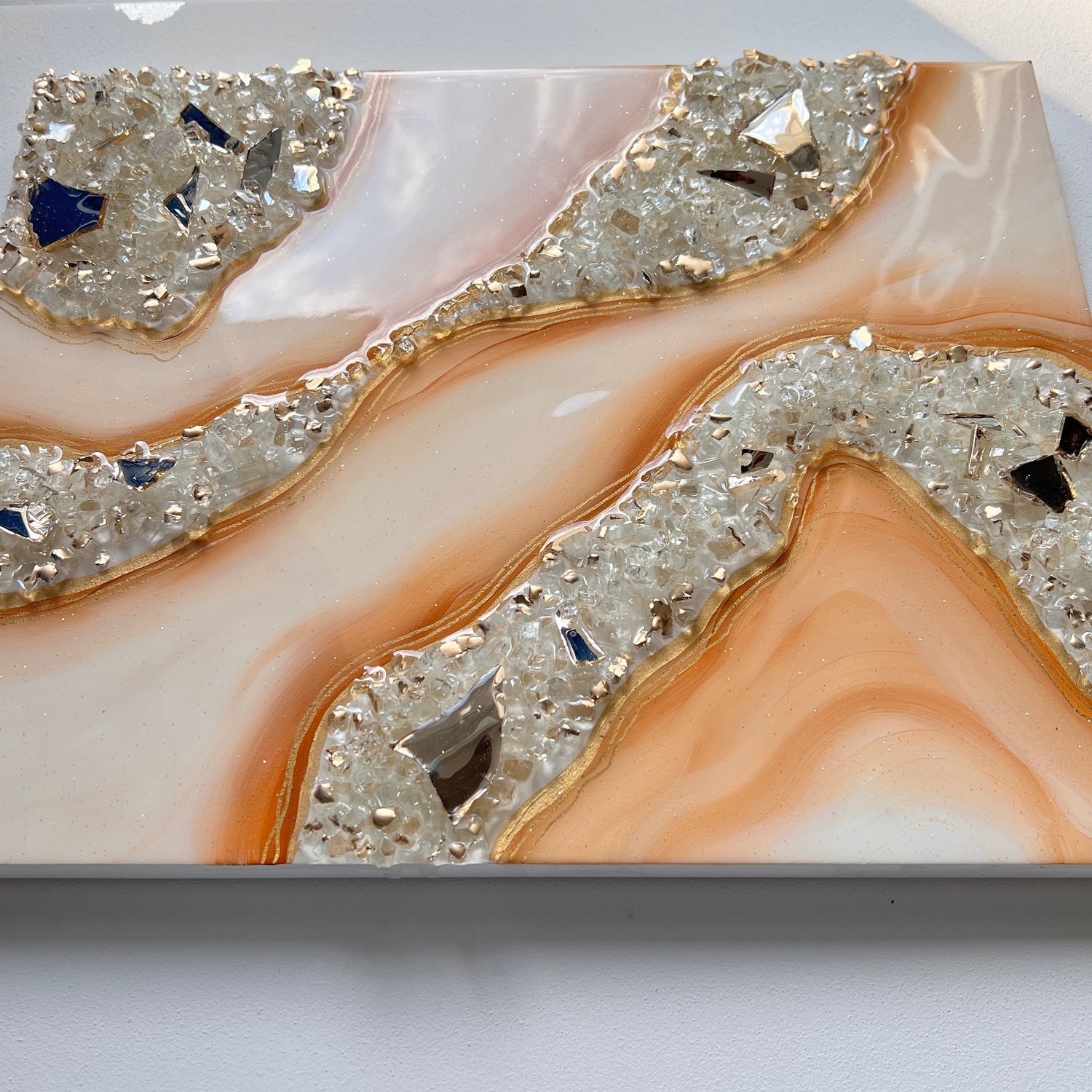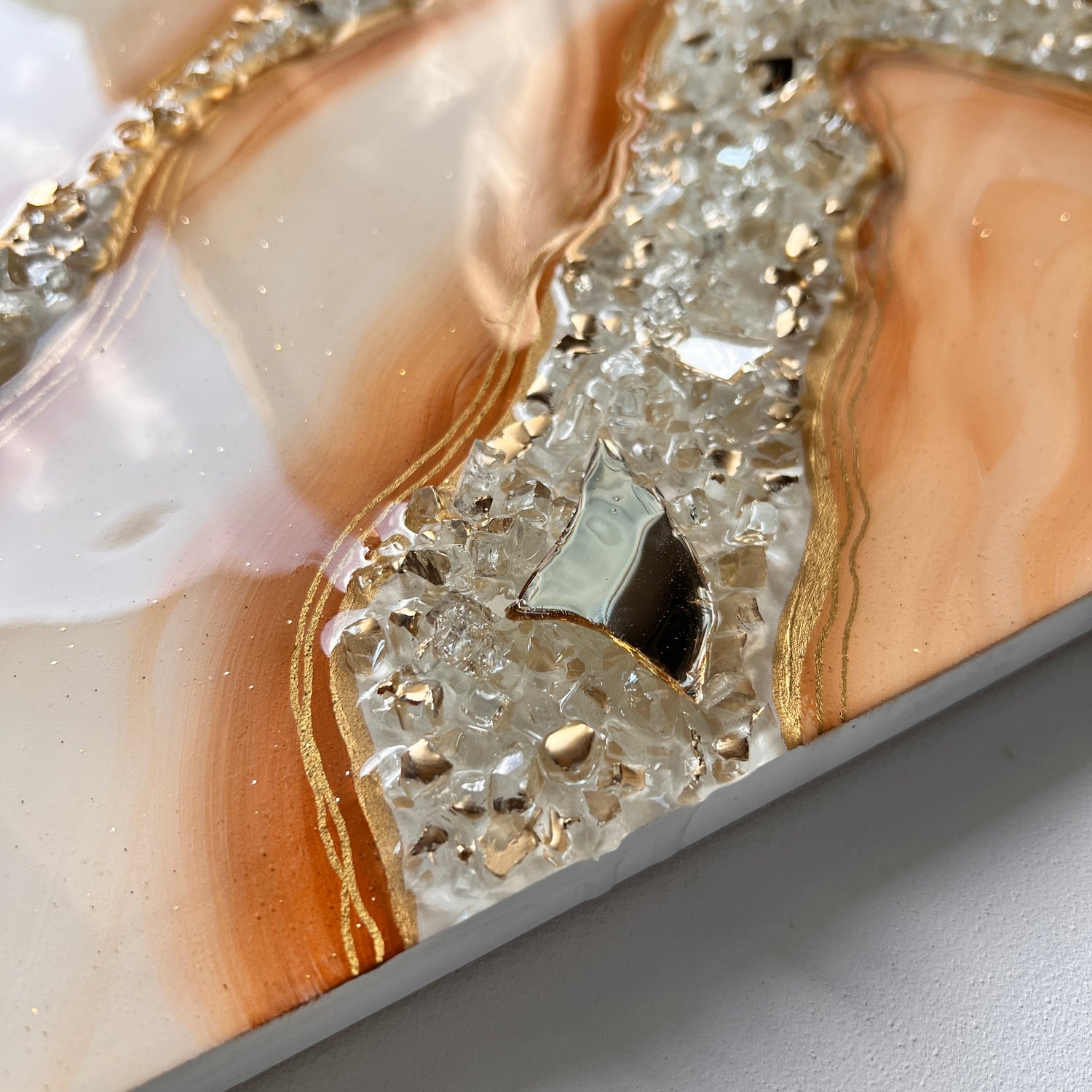In a quiet corner hung a beige and golden artwork that seemed to hum with a soft, ancient magic. Waves of crushed glass swept across the canvas like frozen tides, each crest catching the light in shimmering whispers. Hidden within the ripples were fleeting glimpses of gold, bright, elusive flashes that felt like secrets the ocean might keep for itself. Viewers often paused, drawn in without knowing why, as if the piece tugged gently at memories they’d never lived, offering a moment of stillness wrapped in quiet luxury.