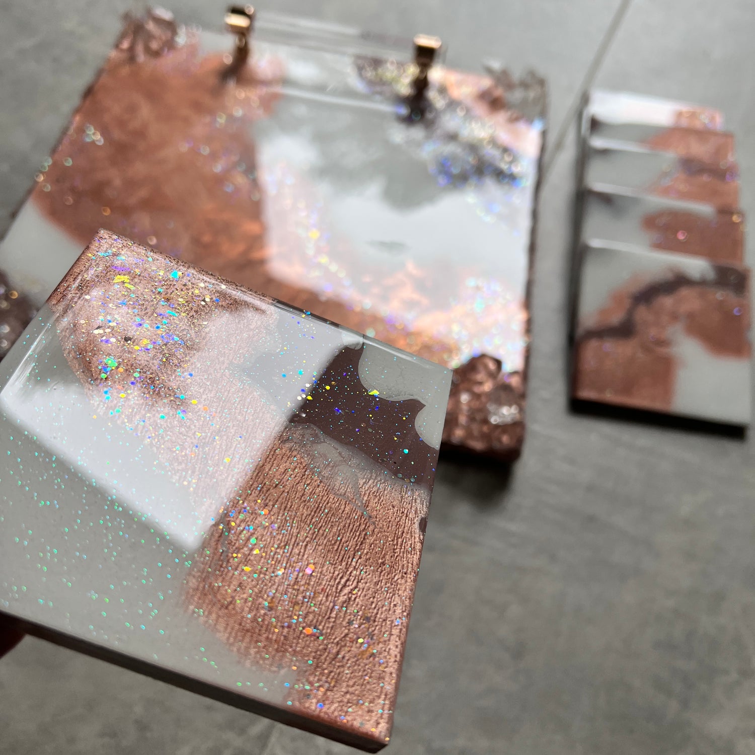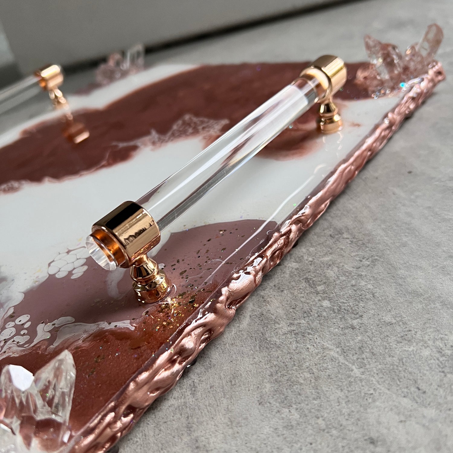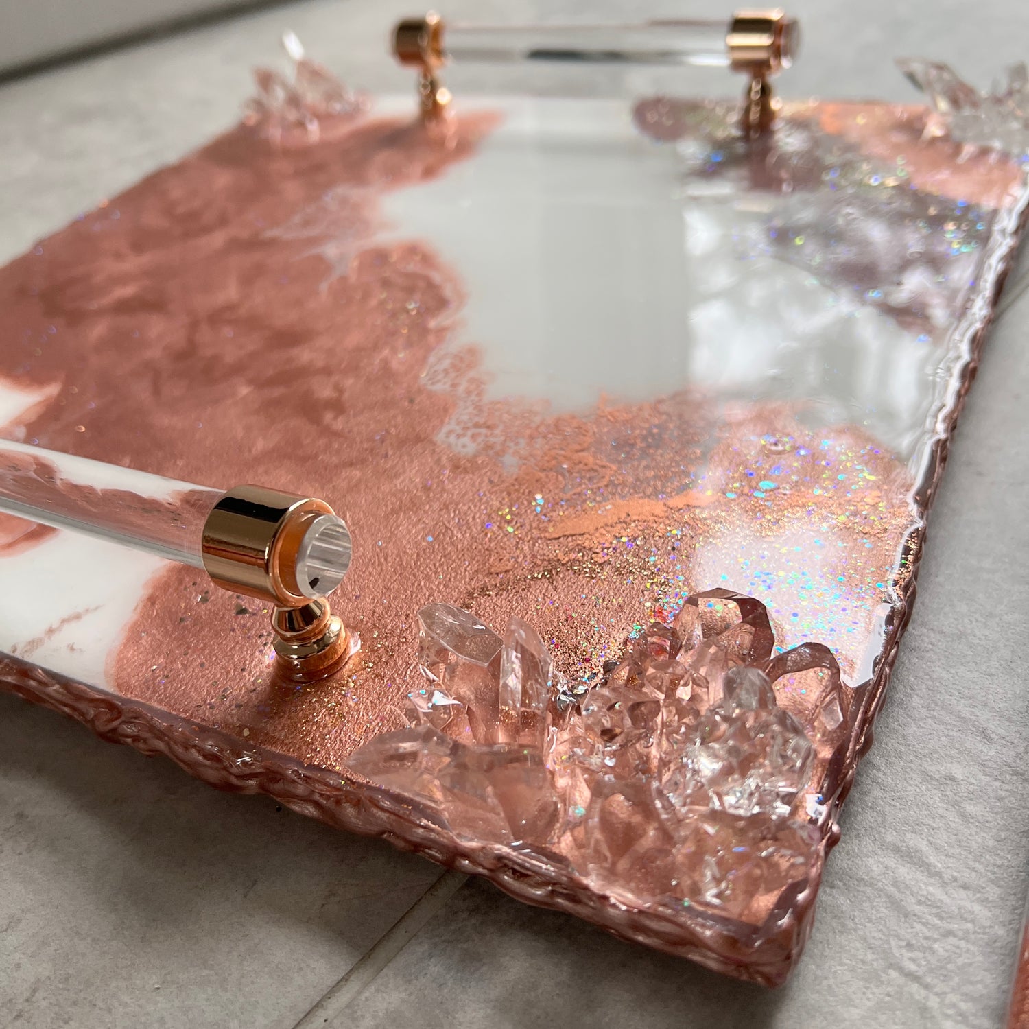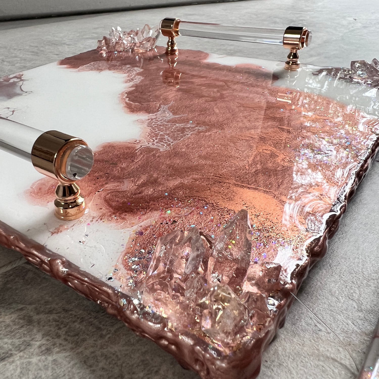 This rose gold luxury tray handcrafted from raw wood is unique is built and layers using wood primer, epoxy resin, pigments, crushed glass and resin crystals. This glam tray boasts a live metallic rosy edge!