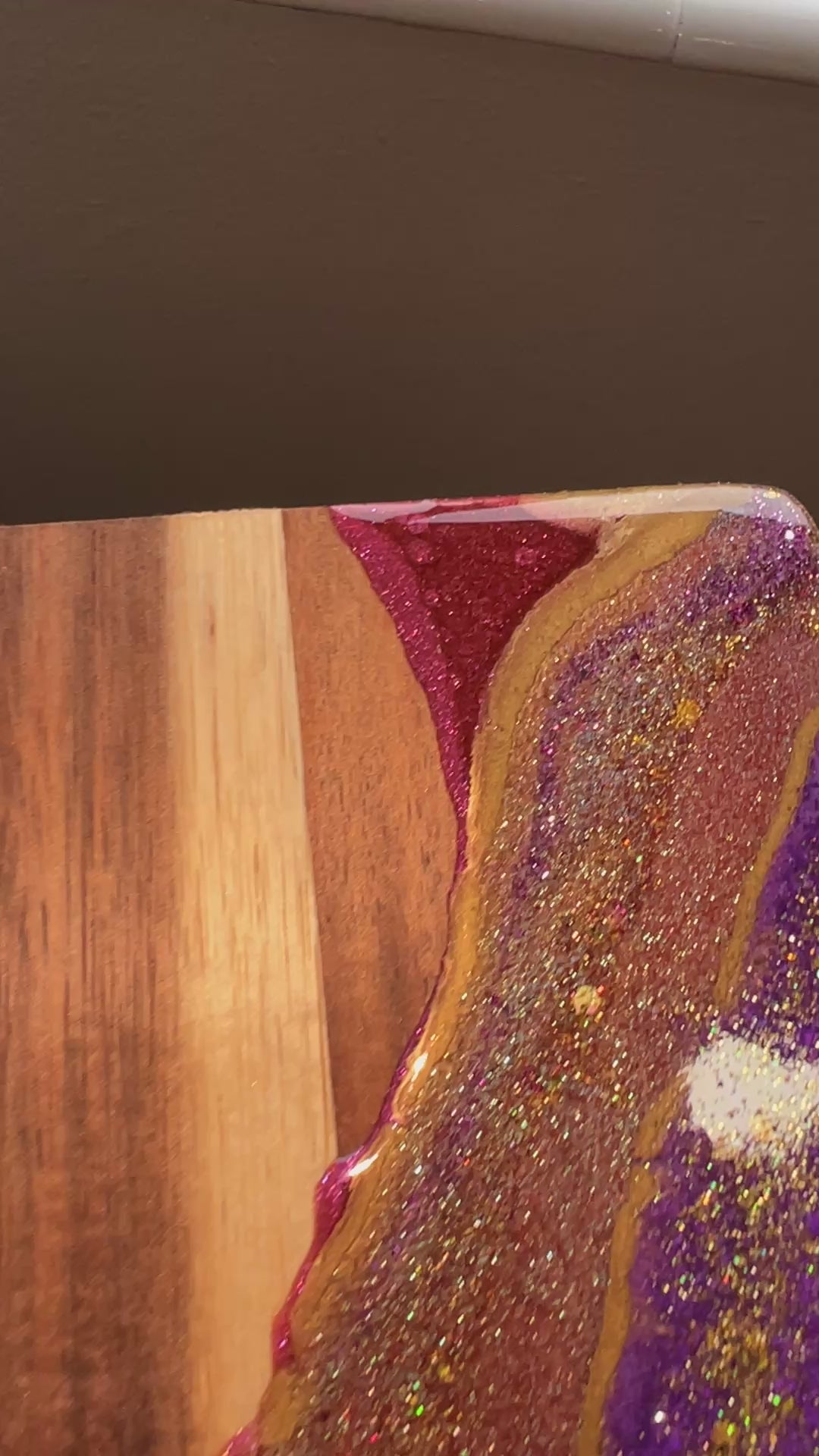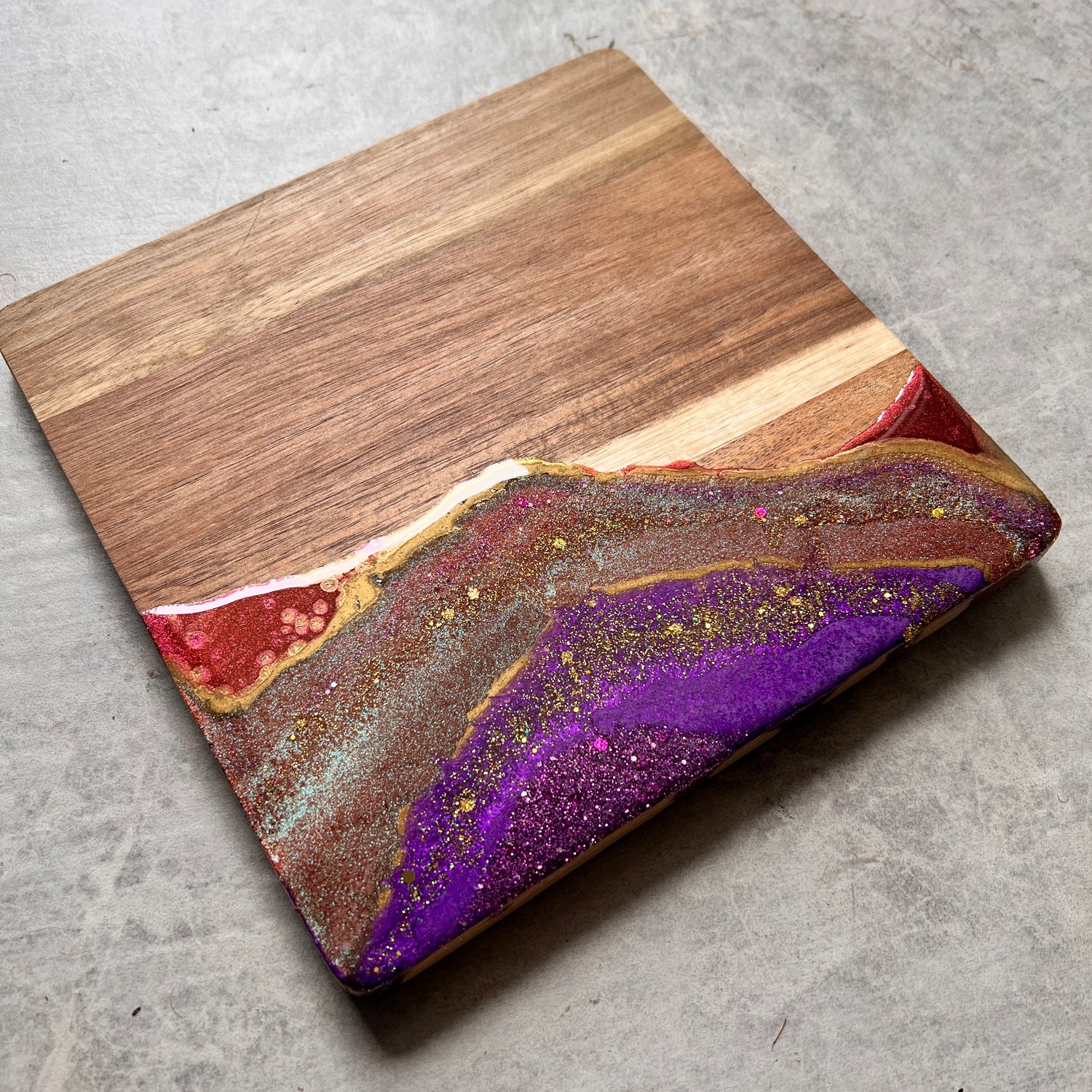 This charcuterie board is completely unique with its blend of colors. Made with Epoxy Resin Art, crushed glass and mixed media embellishments.