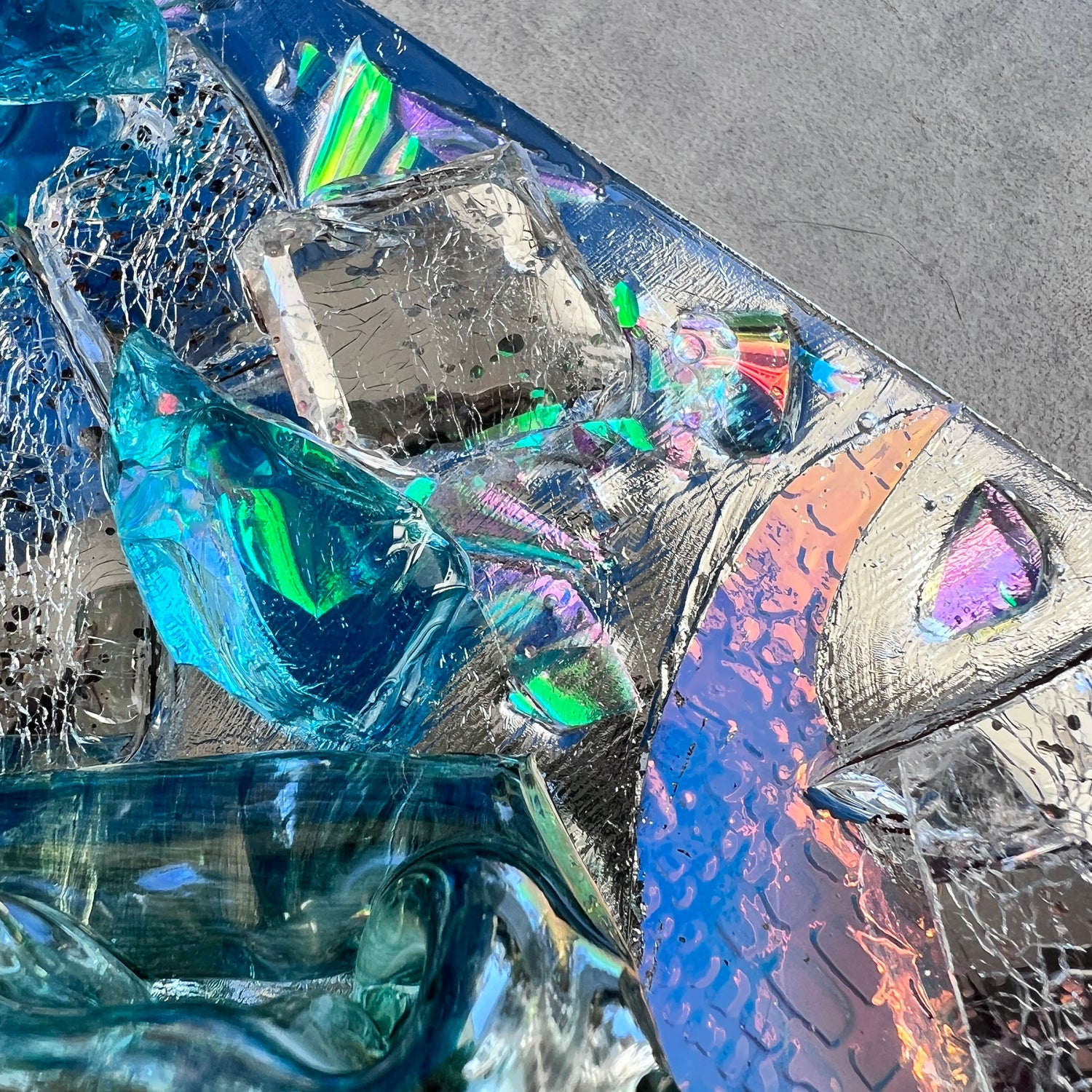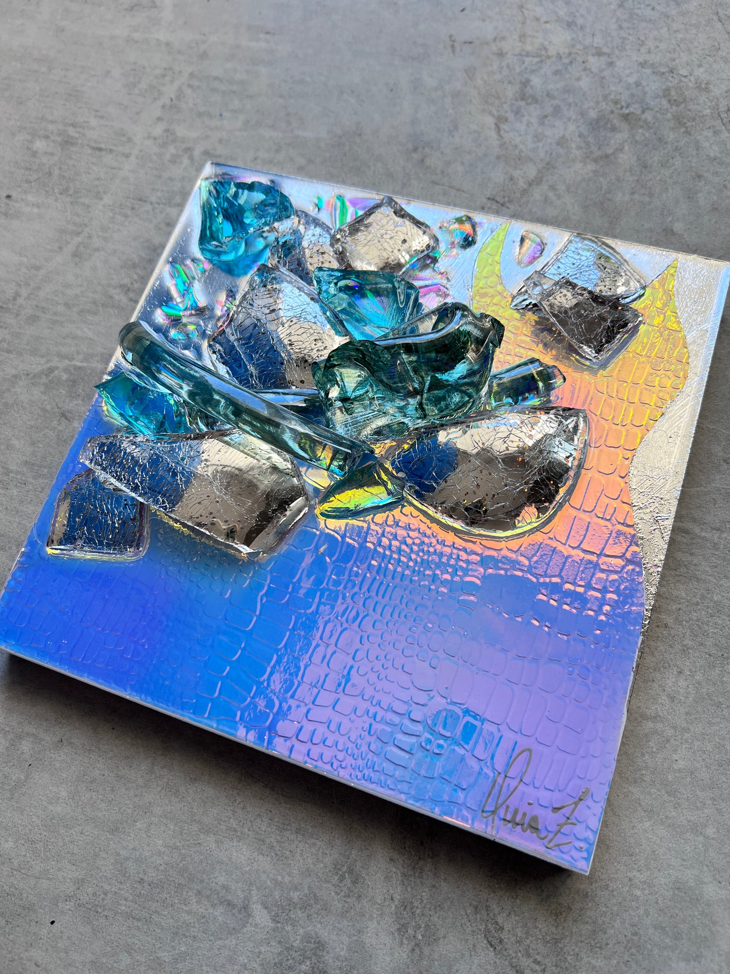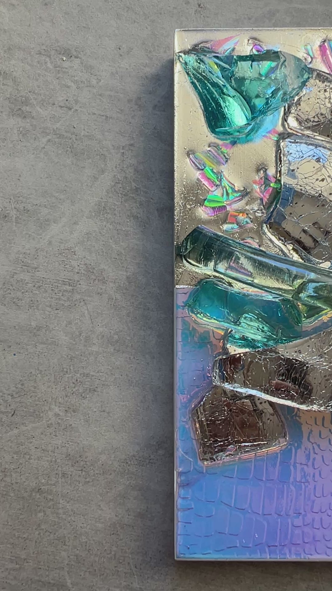 “This artwork unfolds like a secret whispered by the universe itself. The celestial colors—shifting blues, violets, and silver—move across the surface like echoes of distant galaxies drifting through open sky. The reflective fragments shimmer as if they’ve captured pieces of daylight, holding the blue of the heavens inside their cracked, crystalline forms. Each shard becomes a tiny universe, mirroring the vast one above us, reminding us that the same mysteries stretched across the cosmos also live quietly within our world. Skyborn Echoes is a story of cosmic reflection, where the sky meets shattered starlight, and the universe bends low enough for us to see ourselves in its glow.”