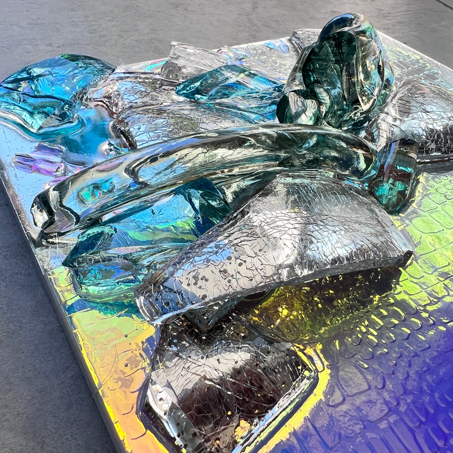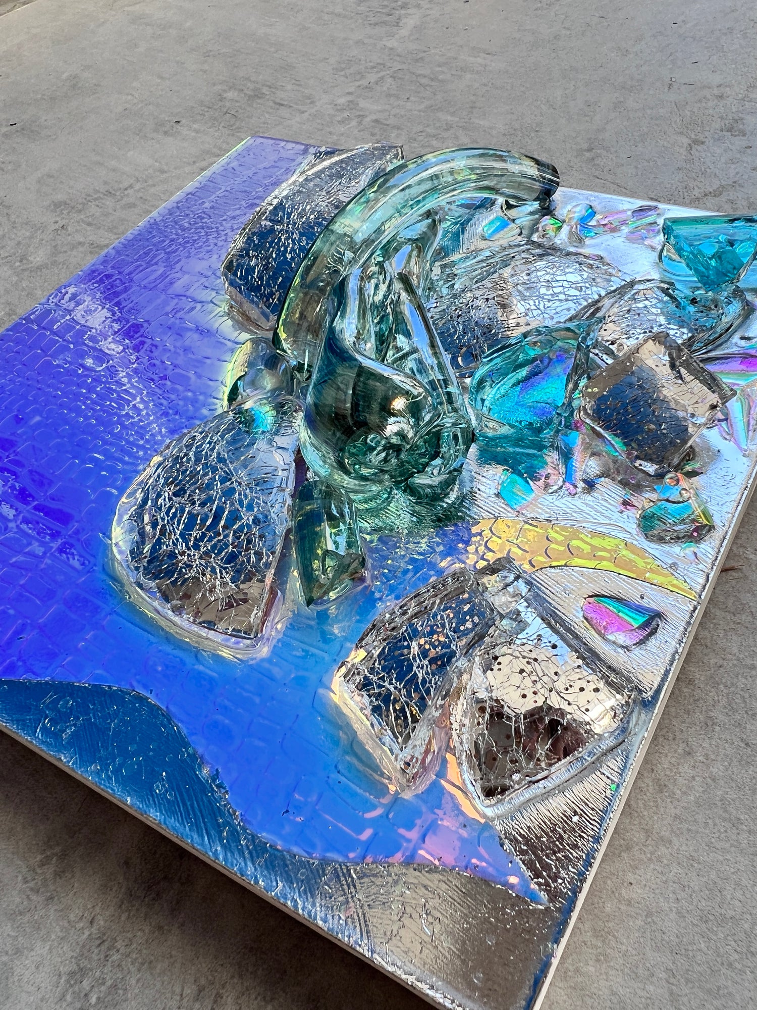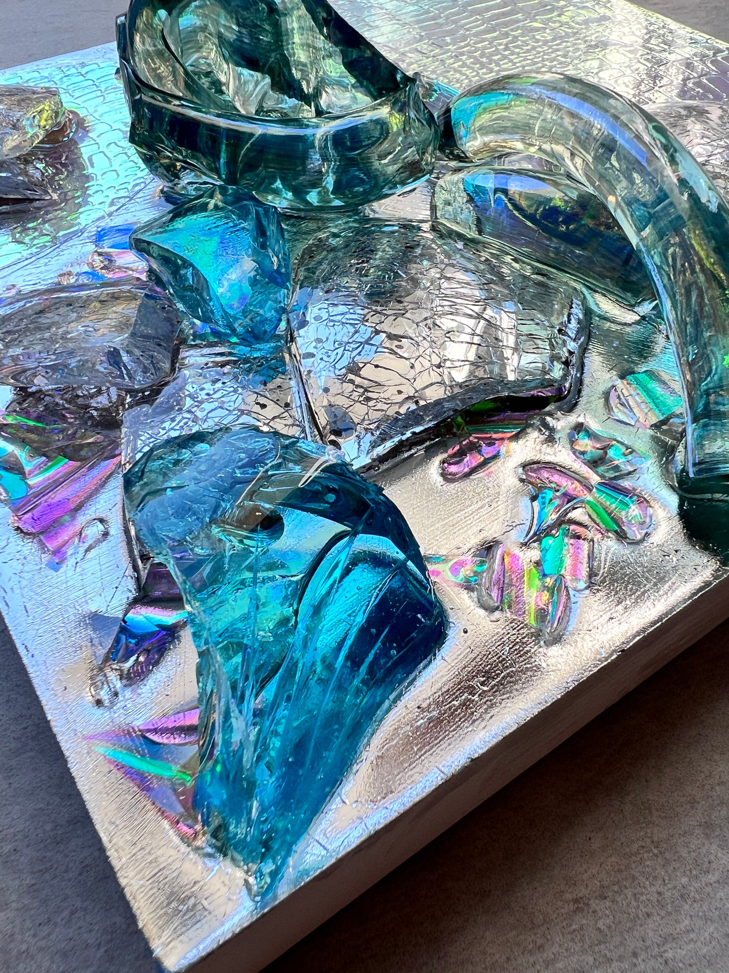 “This artwork unfolds like a secret whispered by the universe itself. The celestial colors—shifting blues, violets, and silver—move across the surface like echoes of distant galaxies drifting through open sky. The reflective fragments shimmer as if they’ve captured pieces of daylight, holding the blue of the heavens inside their cracked, crystalline forms. Each shard becomes a tiny universe, mirroring the vast one above us, reminding us that the same mysteries stretched across the cosmos also live quietly within our world. Skyborn Echoes is a story of cosmic reflection, where the sky meets shattered starlight, and the universe bends low enough for us to see ourselves in its glow.”