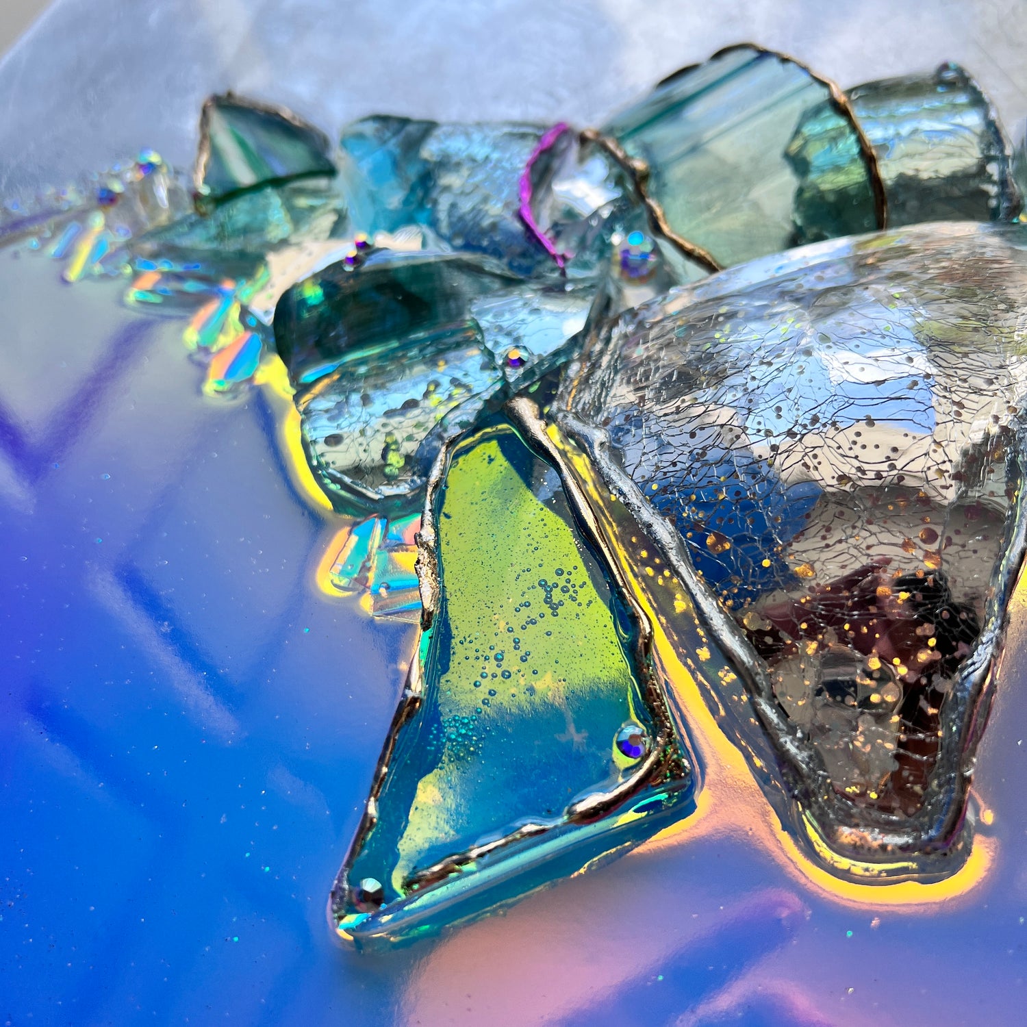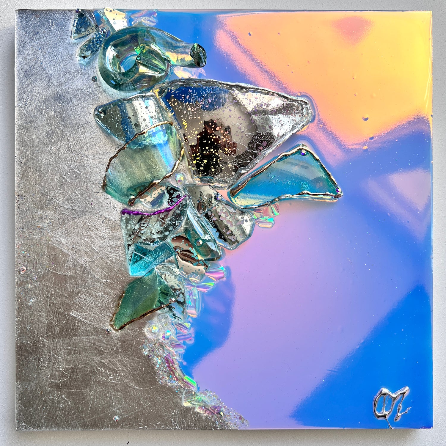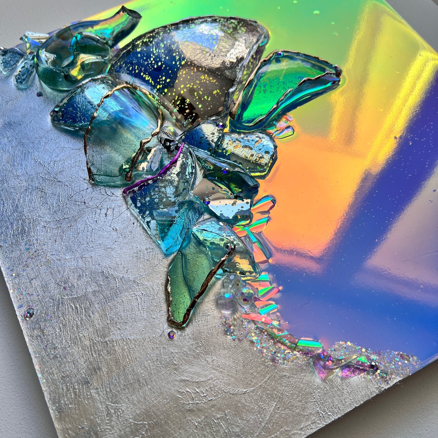 Nothing here stays the same for long. This artwork is a living lesson in adaptation, an alchemy of color that shifts like the light. Each angle reveals a new version of the piece, reminding us that transformation is not only natural, it’s beautiful. The reflective shards act like tiny mirrors of possibility, teaching that evolution is constant and survival often begins with the willingness to shimmer differently than before.
