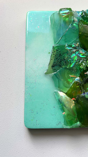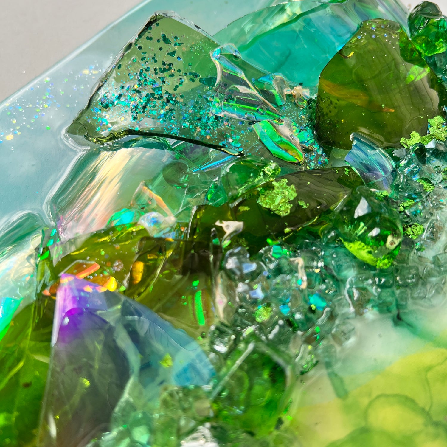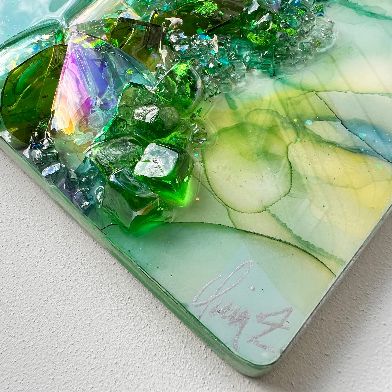 The artwork glowed as if it had captured a secret between earth and water. Lime green and deep blue swirled together, meeting in gentle currents like a forest stream slipping into a hidden lagoon. Iridescent green flakes shimmered across the surface, catching the light with a quiet magic.